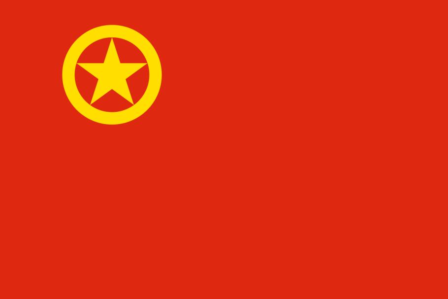 2.制作方法是:黄圈围着的黄色五角星,缀在旗面左上方,制旗时,先将旗面对分为4个相等的长方形,将左(它的反面为右)上角长方形上下分为12等份,再以左上角长方形中心点为圆心,3等份及4等份长为半径画两圆周,两圆周之间就是黄色圆圈。再在内圆周上定出5个等距离的点,其中一点位于圆周正上方。将此5点中各相隔的两点相联成直线,此5直线之外轮廓线就是黄色五角星的外缘。