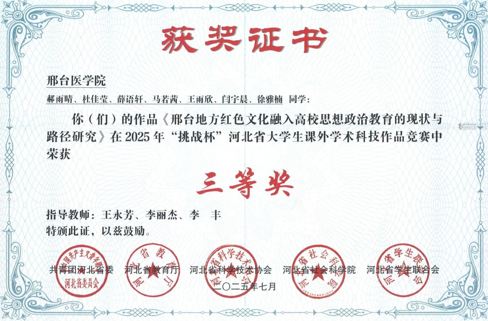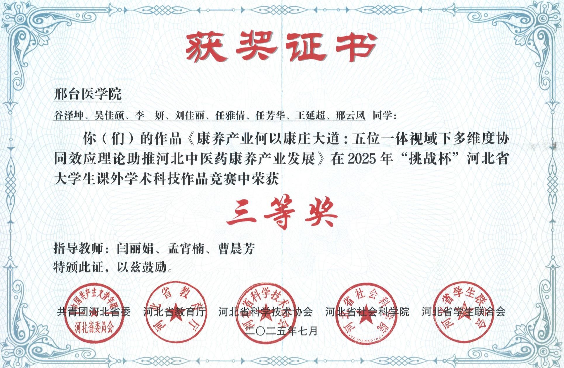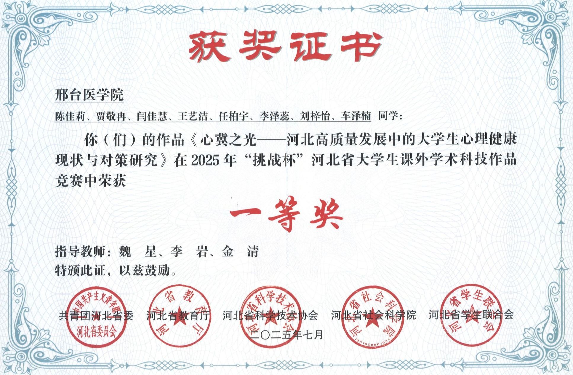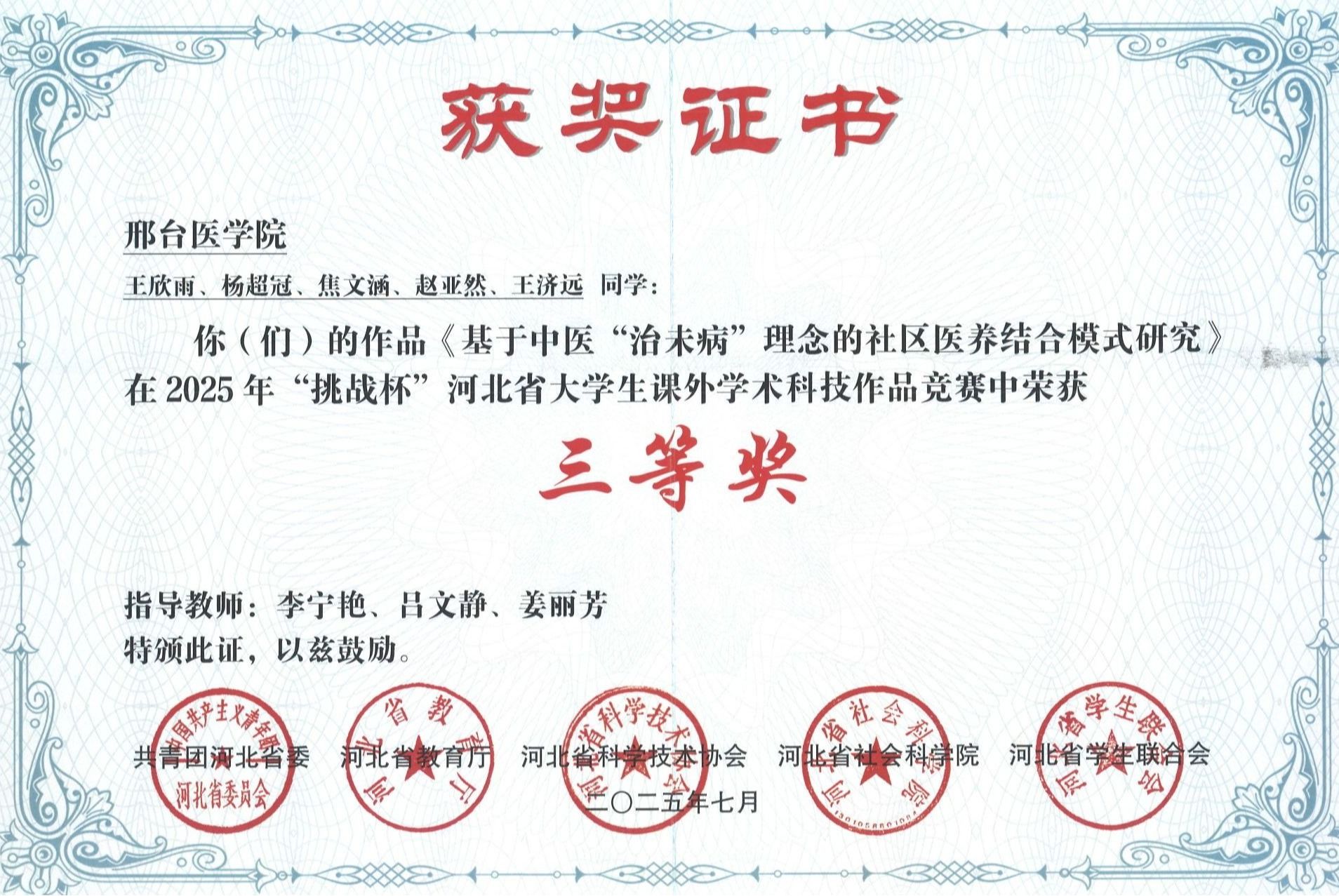 邢台医学院2025年“挑战杯”大学生创业计划竞赛获奖证书
