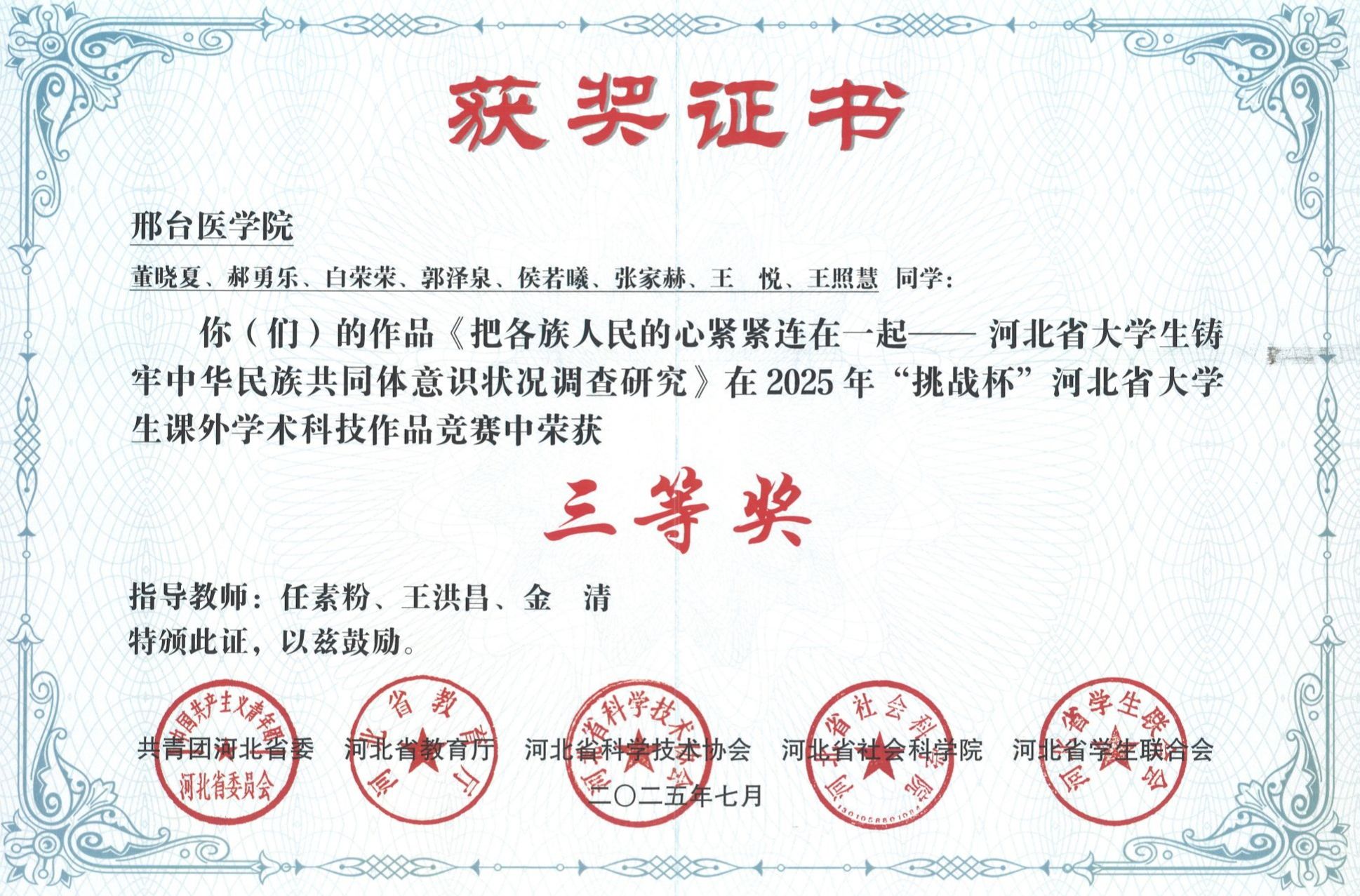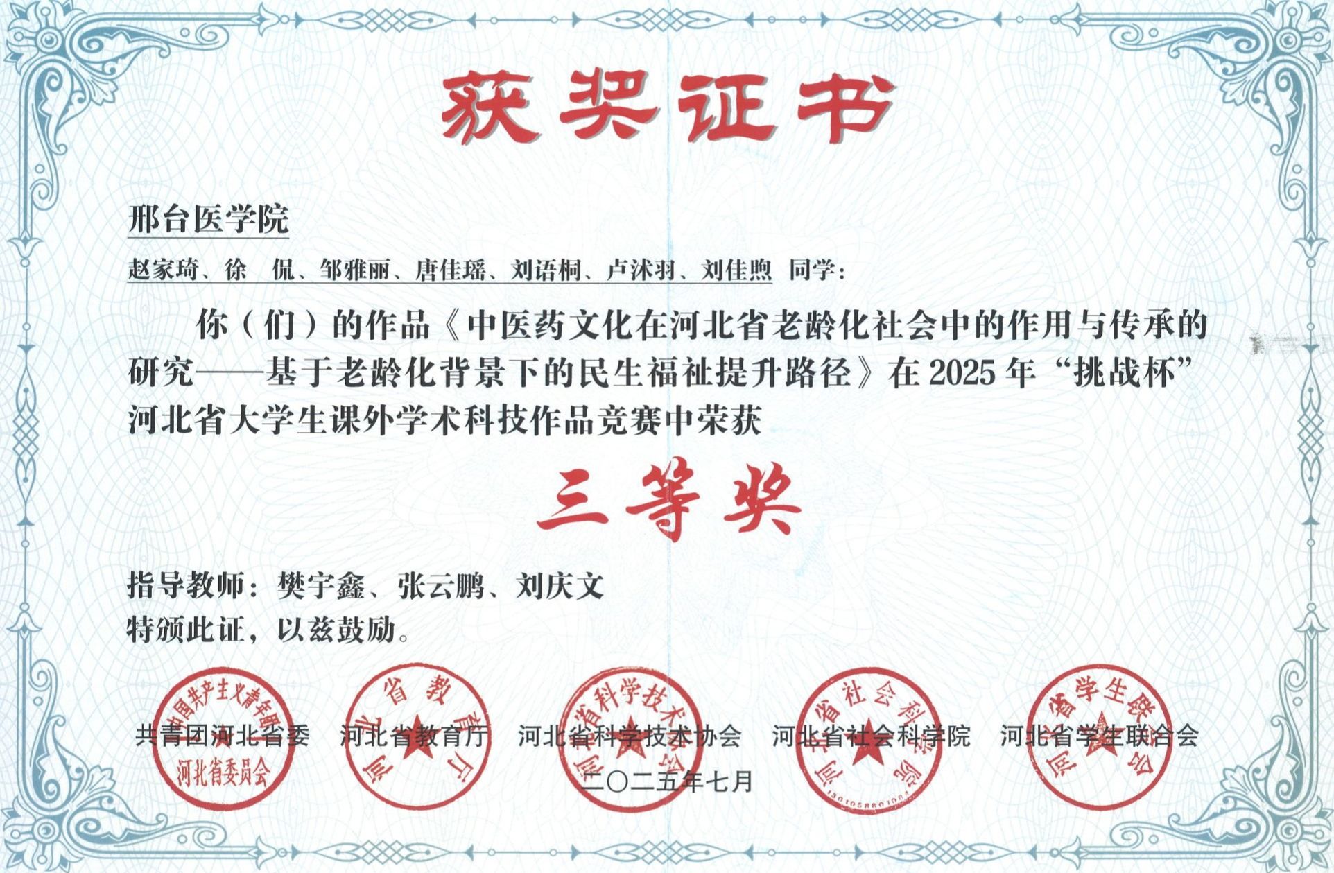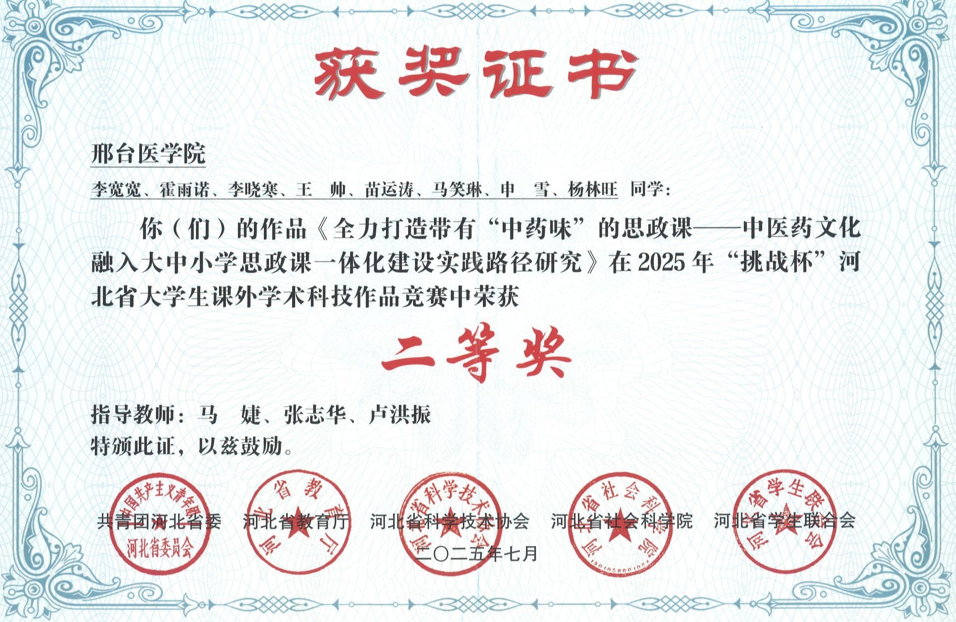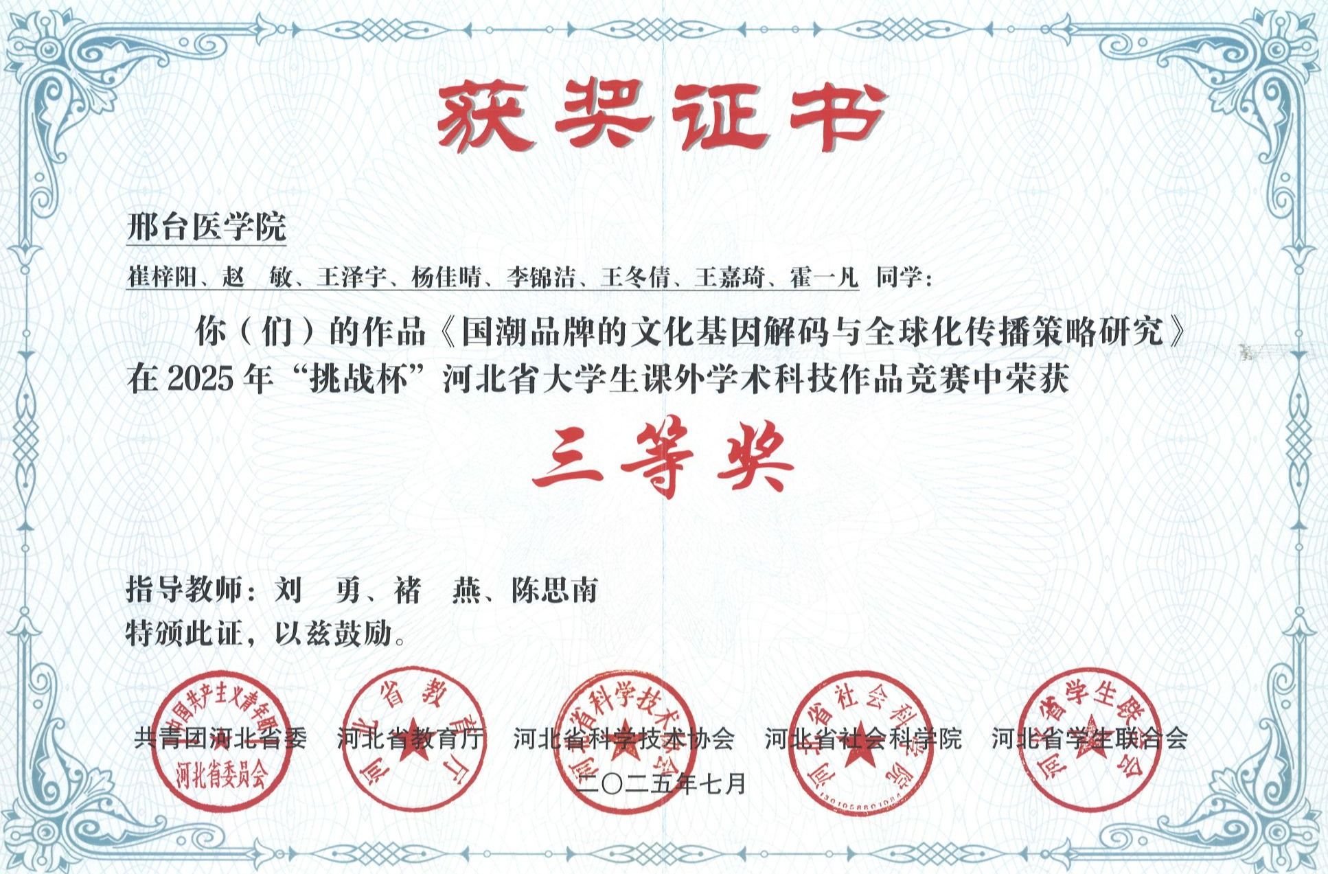 邢台医学院2025年“挑战杯”大学生创业计划竞赛获奖证书