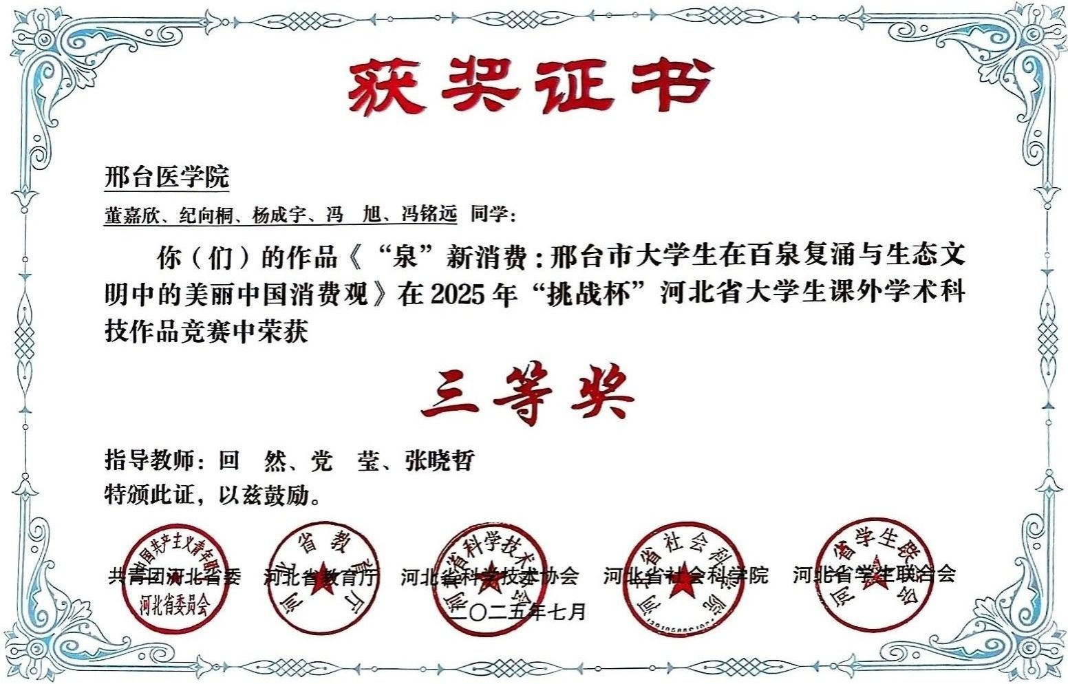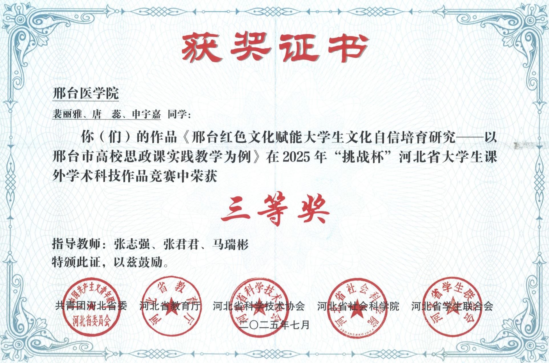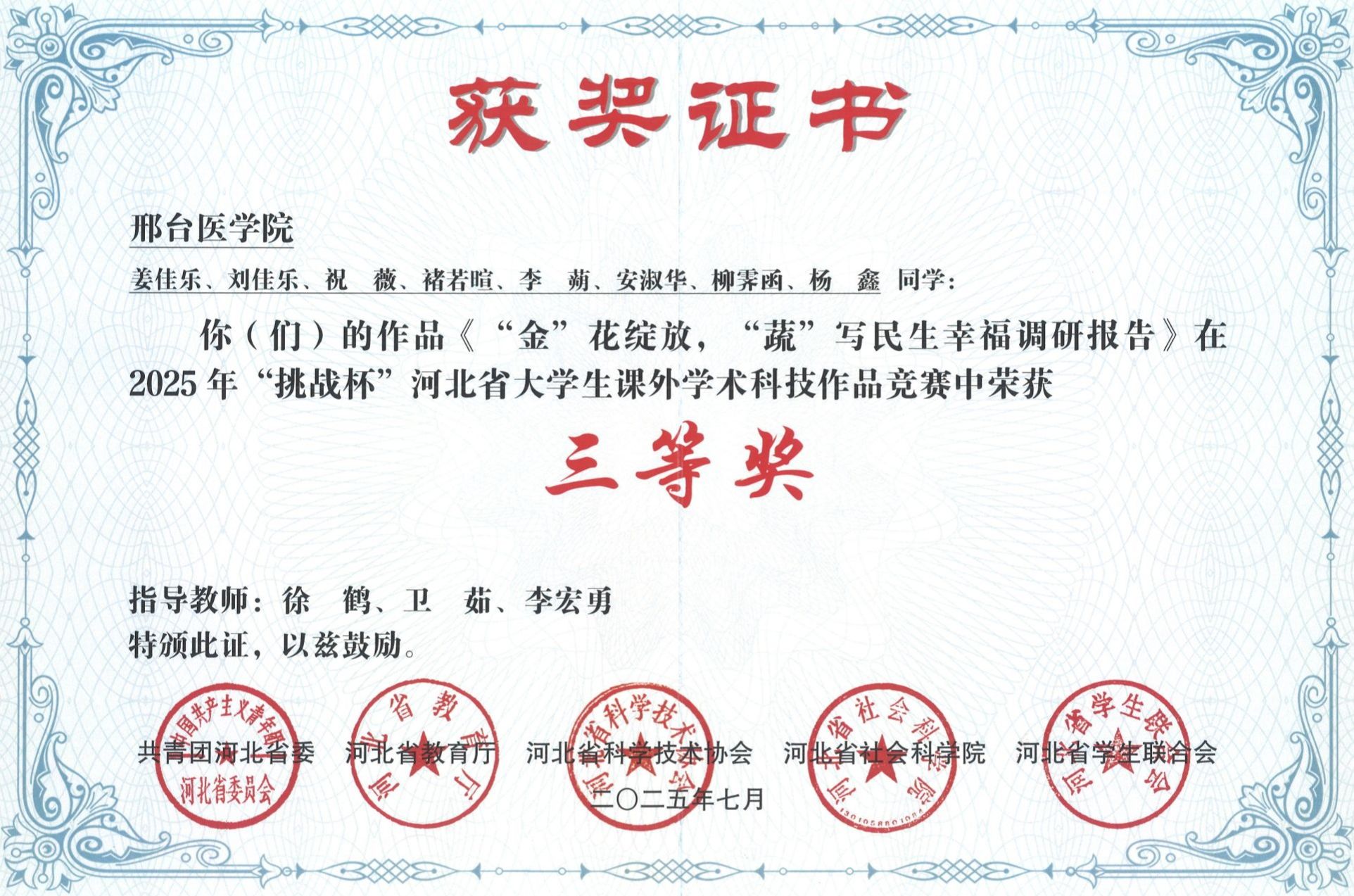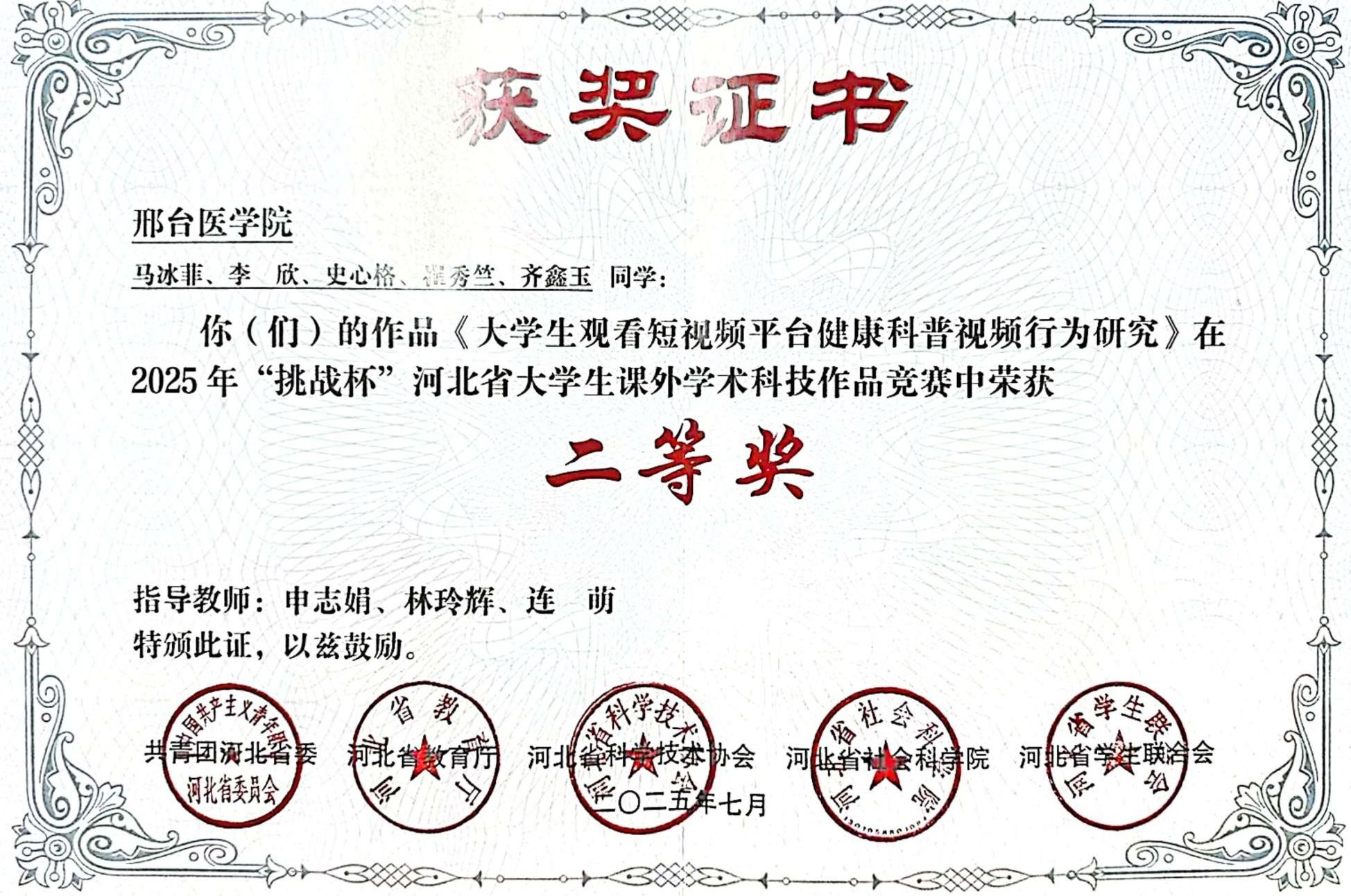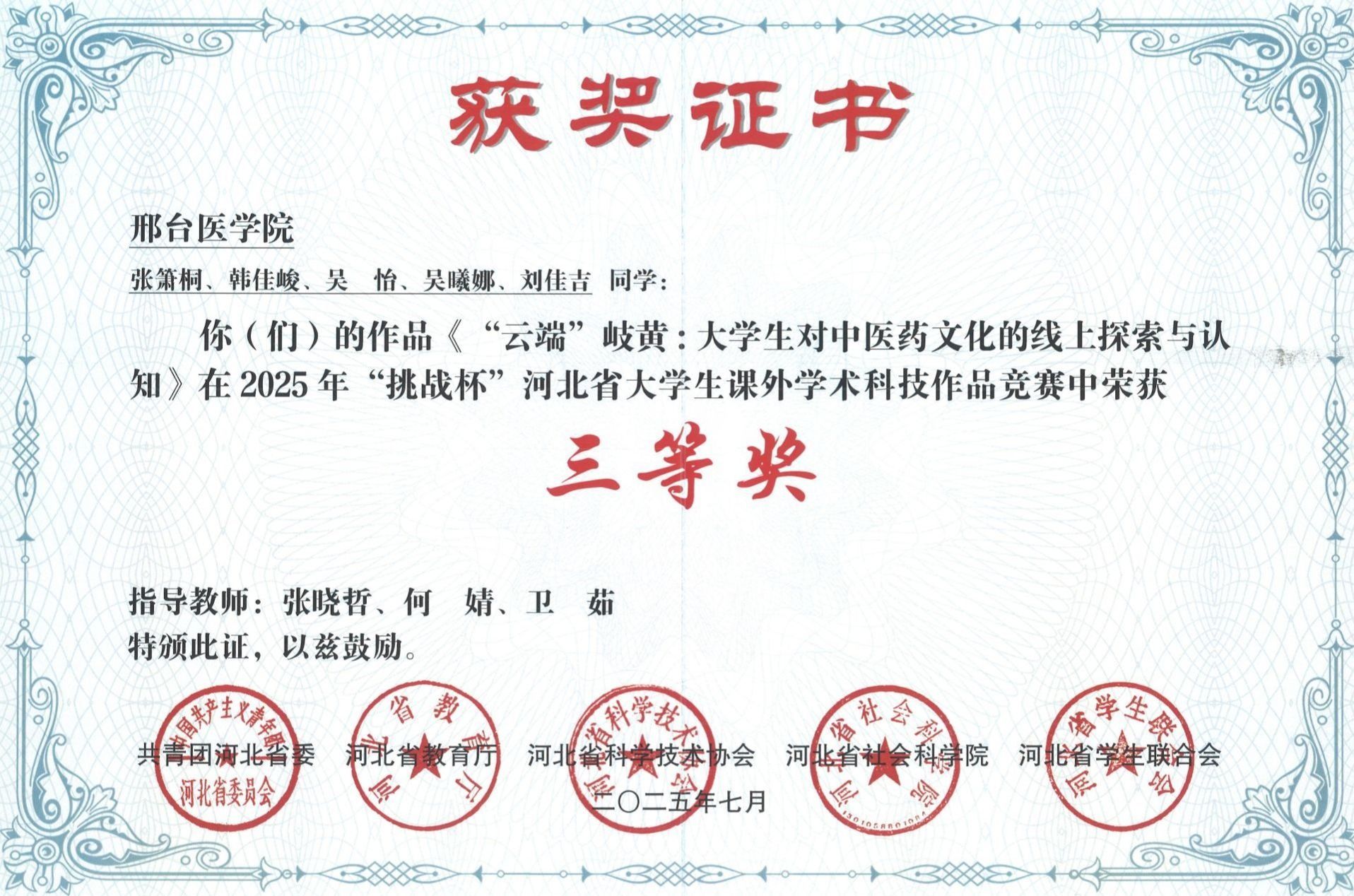 邢台医学院2025年“挑战杯”大学生创业计划竞赛获奖证书