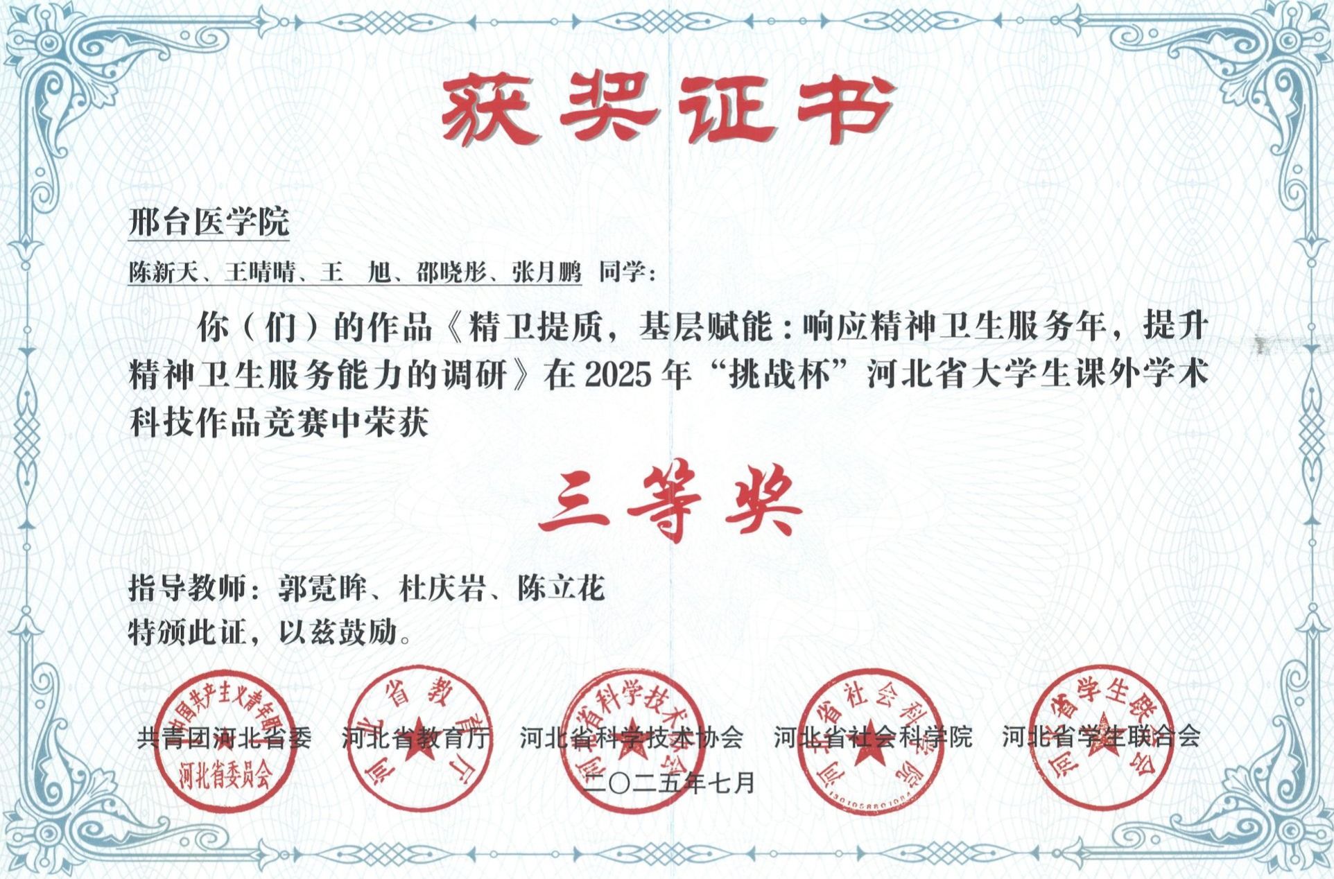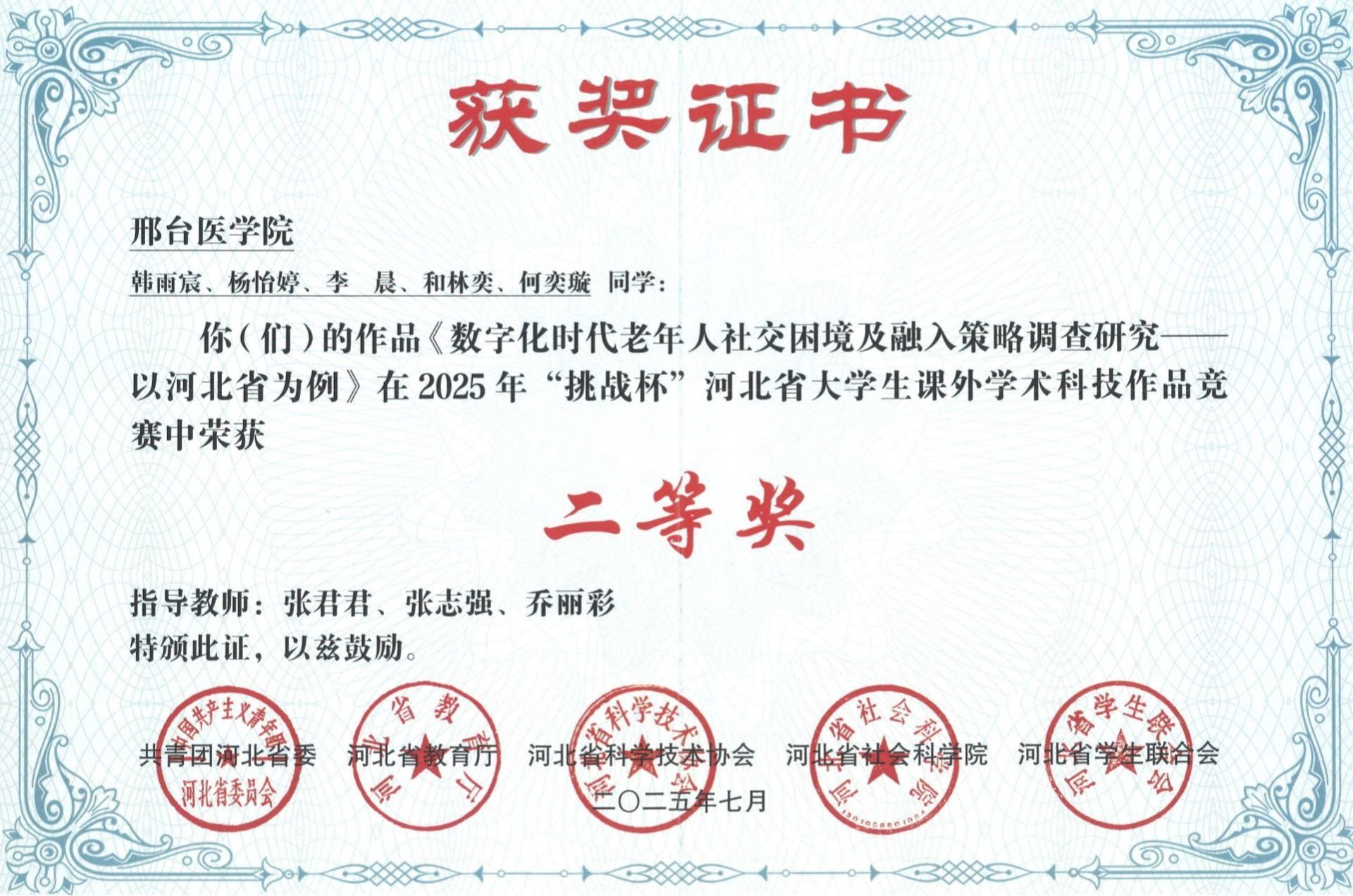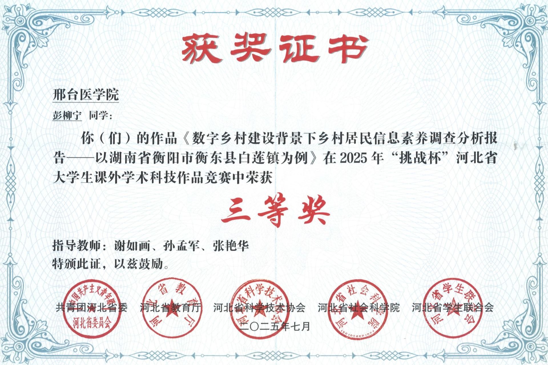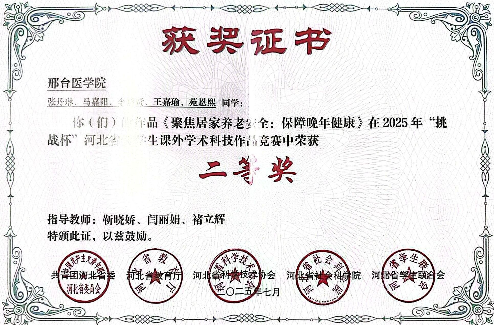 邢台医学院2025年“挑战杯”大学生创业计划竞赛获奖证书