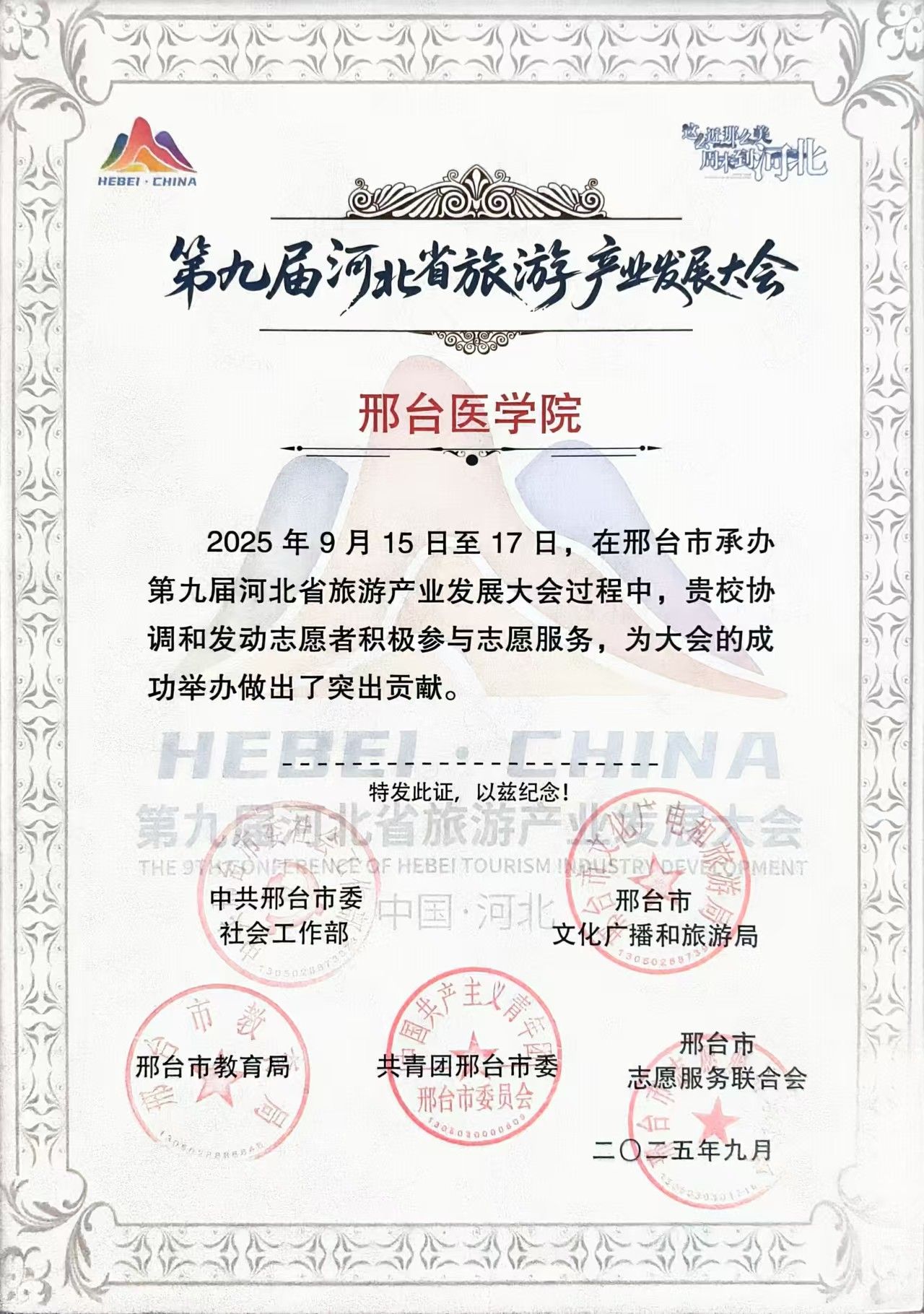 2025年我校在第九届河北省旅游产业发展大会中被评为“优秀组织奖”荣誉称号