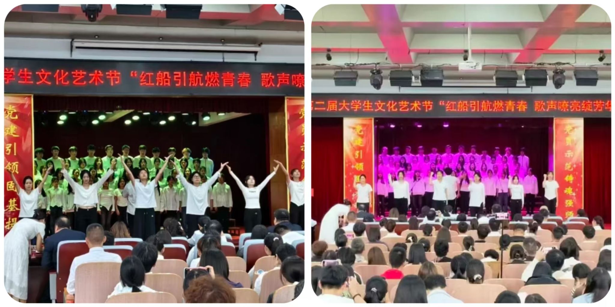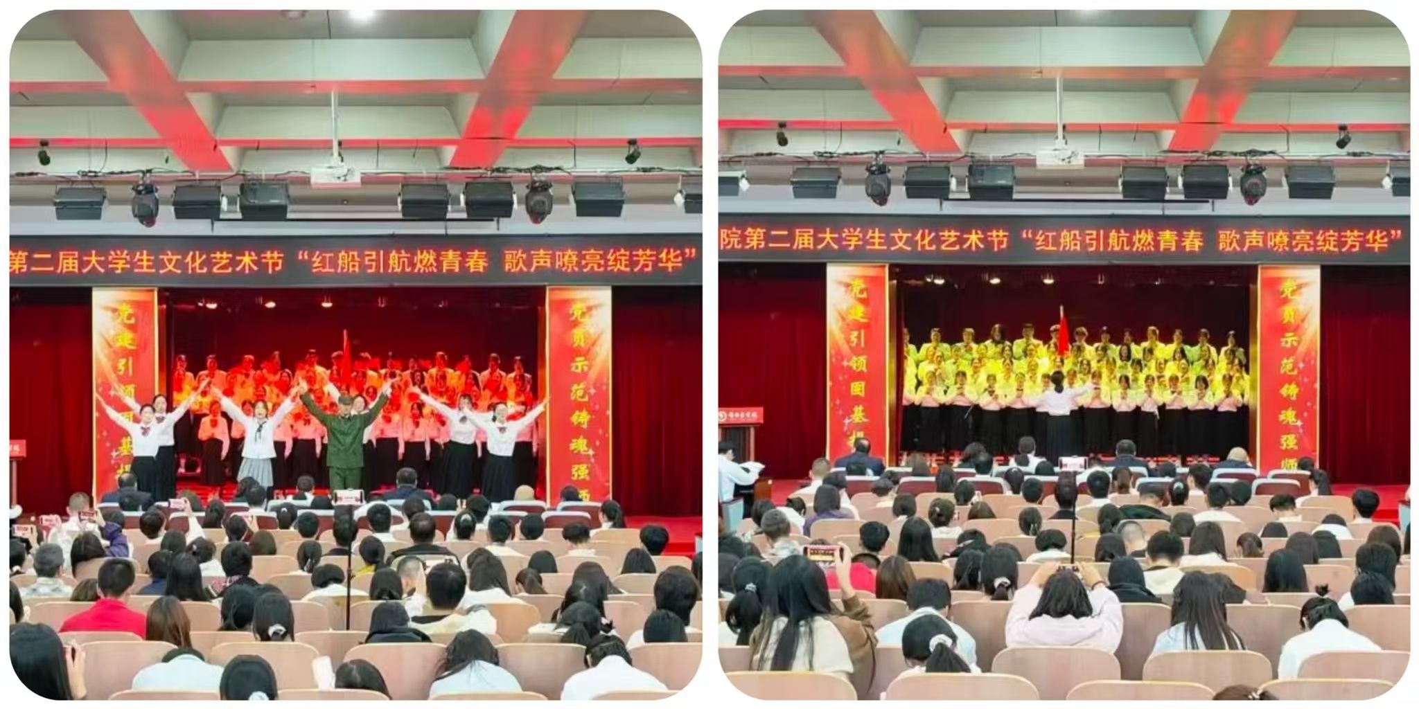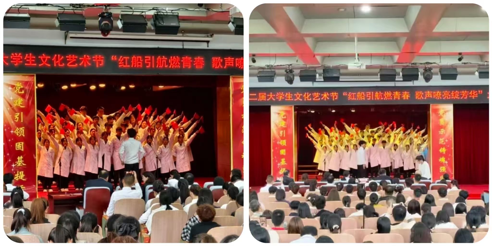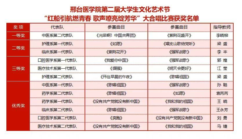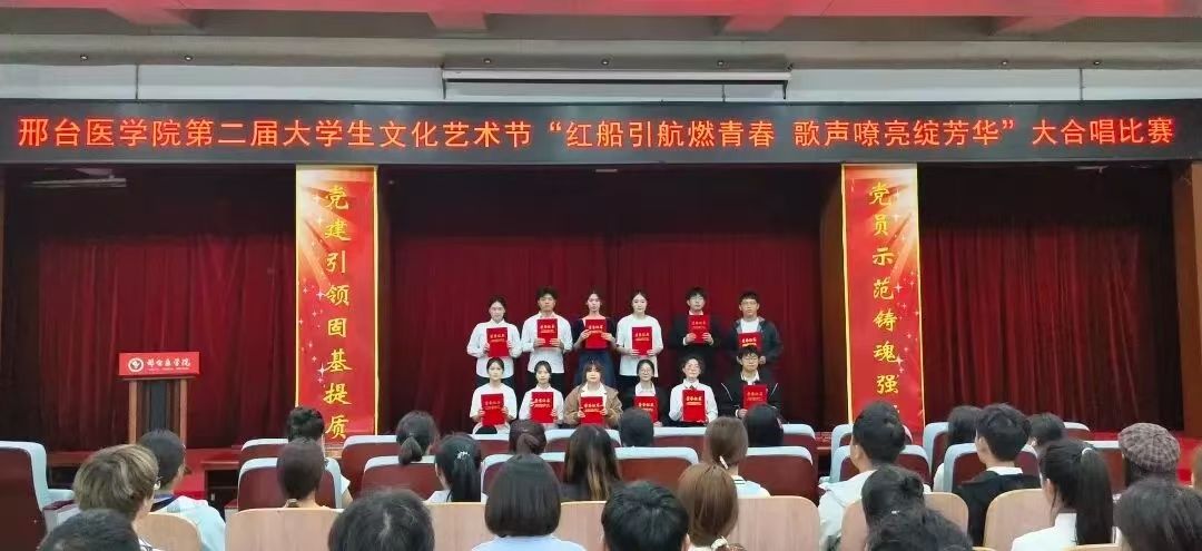 为赓续红色基因、彰显新时代青年风采,近日,我校第二届大学生文化艺术节 “红船引航燃青春 歌声嘹亮绽芳华” 大合唱比赛在学校报告厅盛大启幕。赛事由口腔医学系团总支精心主办。现场,团委老师、各系团总支书记、校级社团指导教师代表及300余名学生代表齐聚,共同见证这场融红色精神传承与青春活力绽放于一体的文化盛宴,让红色旋律成为连接信仰与青春的纽带。走进比赛现场比赛现场气氛炽热,掌声与欢呼声此起彼伏,十二支代表队身着整齐服装列阵登台,精神昂扬如朝阳。率先登场的口腔医学系第二代表队,以一曲《奔跑》拉开表演序幕。明快节奏里满是朝气;随后一曲《没有共产党就没有新中国》,手中国旗舞动、红绸飞扬,勾勒出青春与信仰交融的热烈图景。药学系第二代表队选唱《歌唱祖国》与《如愿》,前者气势恢宏,字里行间尽是自豪;后者细腻婉转,旋律中满藏感恩,唱出医学生的赤诚。医疗技术系第一代表队用《倔强》的激昂旋律诉说初心不改,以《明天会更好》的温柔声线寄语未来,满是向上力量。护理系第一代表队演绎的《如愿》与《唱支山歌给党听》,歌声深情庄重,在细腻唱腔中传递对家国的赤诚敬意。临床医学系第一代表队创新融合舞蹈与演唱,《紫荆花盛开》与《强军战歌》的旋律里,舞姿与歌声交织,尽显赤子之心与团队感染力。经多轮激烈角逐,中医系第二代表队凭借精湛演唱技巧与极具穿透力的舞台表现,成功斩获全场最高分,荣耀摘得桂冠。