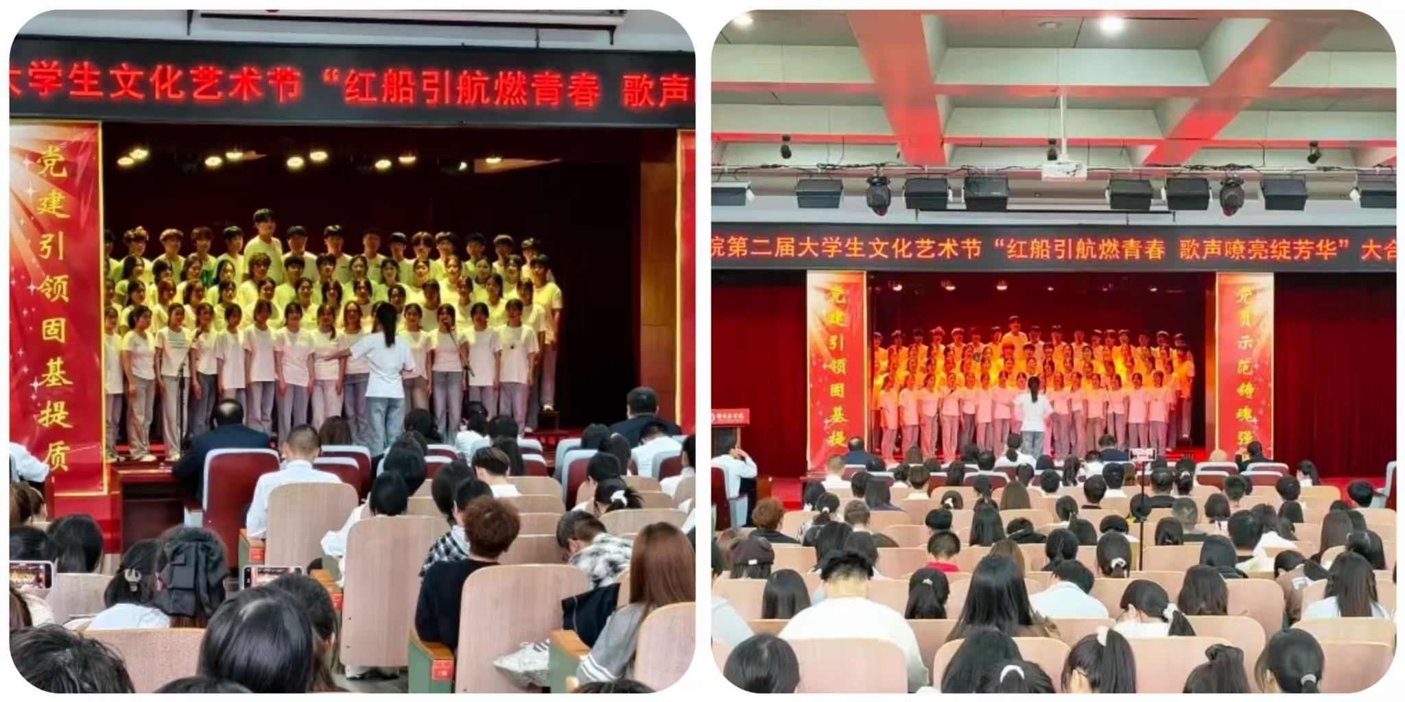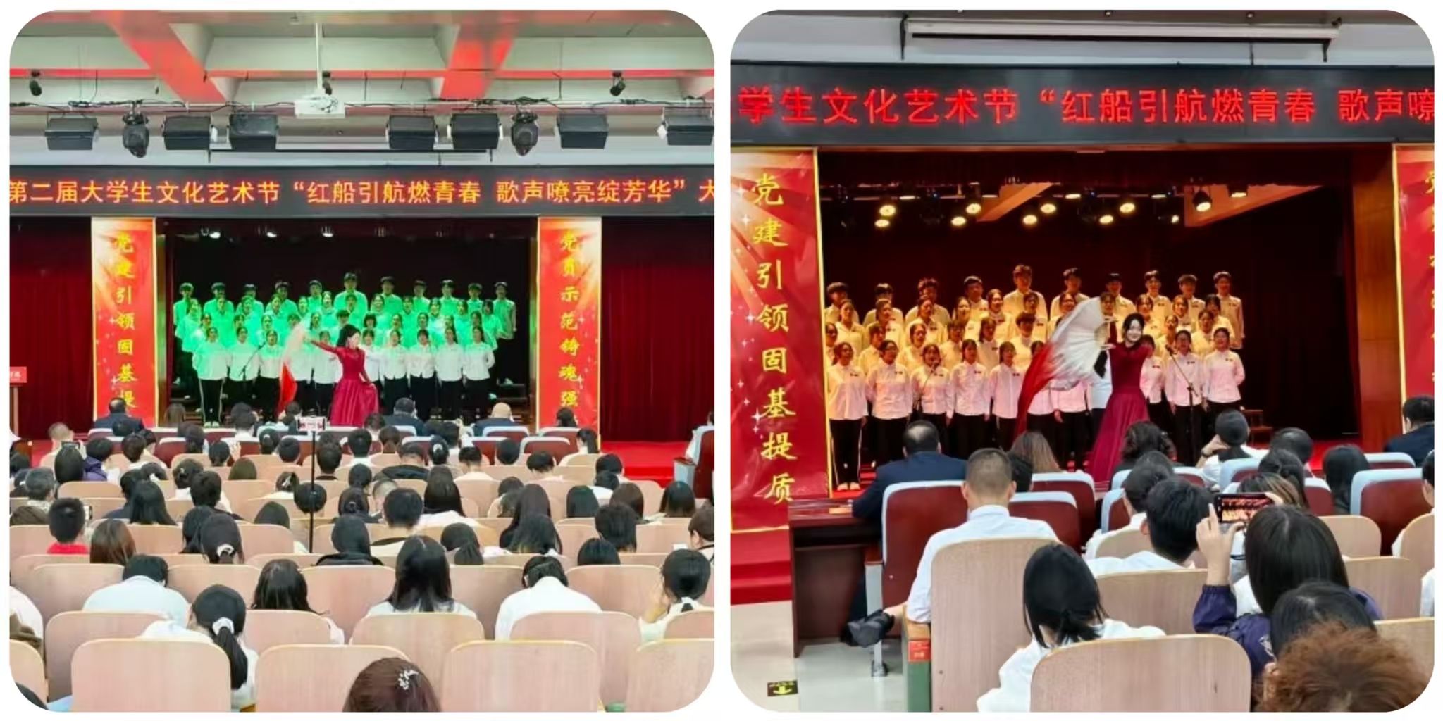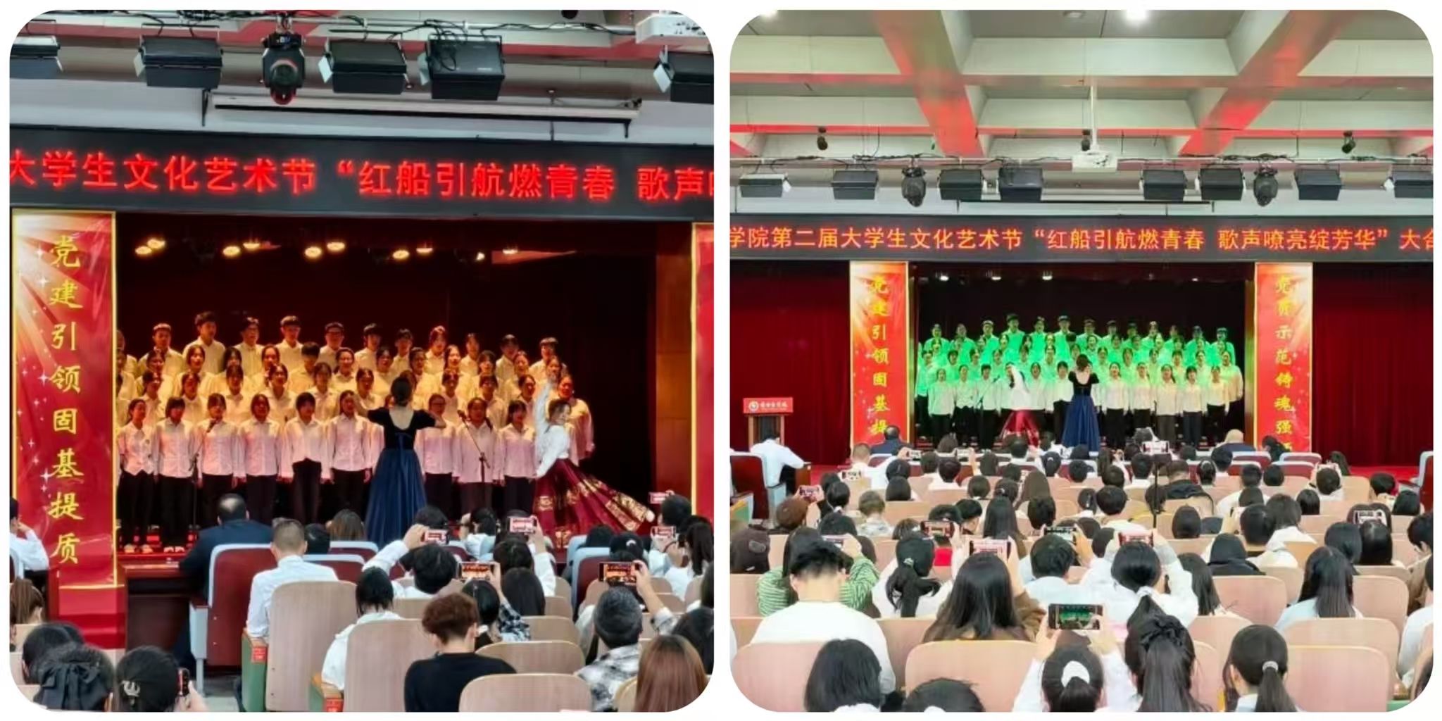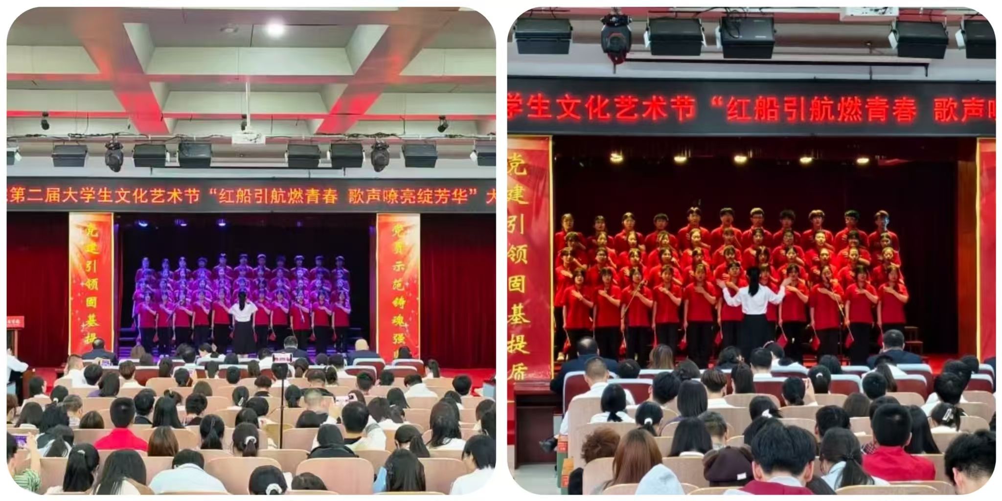为赓续红色基因、彰显新时代青年风采,近日,我校第二届大学生文化艺术节 “红船引航燃青春 歌声嘹亮绽芳华” 大合唱比赛在学校报告厅盛大启幕。赛事由口腔医学系团总支精心主办。现场,团委老师、各系团总支书记、校级社团指导教师代表及300余名学生代表齐聚,共同见证这场融红色精神传承与青春活力绽放于一体的文化盛宴,让红色旋律成为连接信仰与青春的纽带。走进比赛现场比赛现场气氛炽热,掌声与欢呼声此起彼伏,十二支代表队身着整齐服装列阵登台,精神昂扬如朝阳。率先登场的口腔医学系第二代表队,以一曲《奔跑》拉开表演序幕。明快节奏里满是朝气;随后一曲《没有共产党就没有新中国》,手中国旗舞动、红绸飞扬,勾勒出青春与信仰交融的热烈图景。药学系第二代表队选唱《歌唱祖国》与《如愿》,前者气势恢宏,字里行间尽是自豪;后者细腻婉转,旋律中满藏感恩,唱出医学生的赤诚。医疗技术系第一代表队用《倔强》的激昂旋律诉说初心不改,以《明天会更好》的温柔声线寄语未来,满是向上力量。护理系第一代表队演绎的《如愿》与《唱支山歌给党听》,歌声深情庄重,在细腻唱腔中传递对家国的赤诚敬意。临床医学系第一代表队创新融合舞蹈与演唱,《紫荆花盛开》与《强军战歌》的旋律里,舞姿与歌声交织,尽显赤子之心与团队感染力。经多轮激烈角逐,中医系第二代表队凭借精湛演唱技巧与极具穿透力的舞台表现,成功斩获全场最高分,荣耀摘得桂冠。