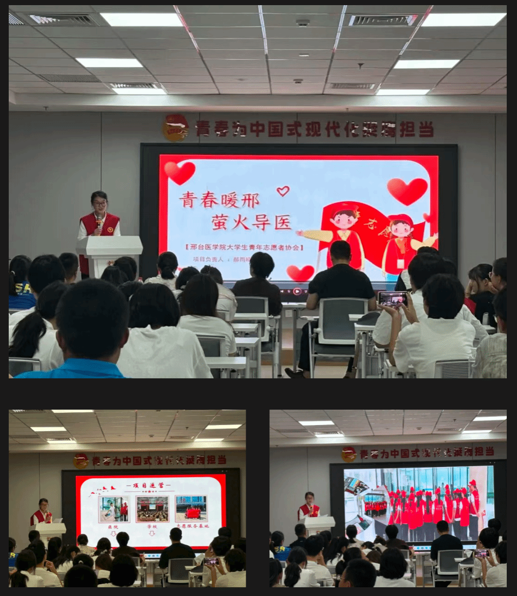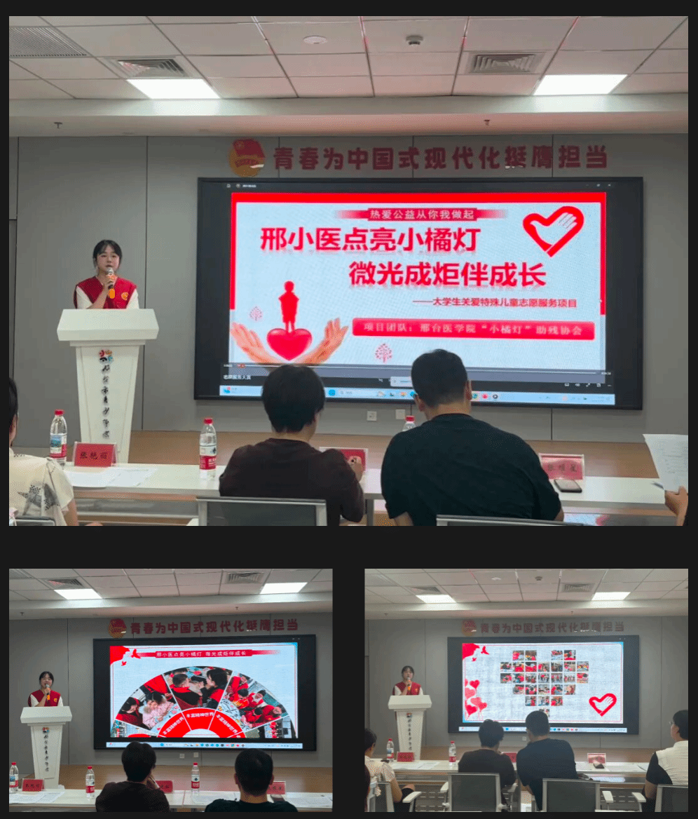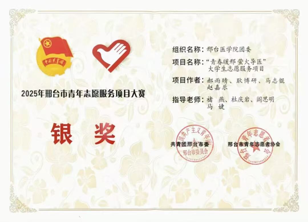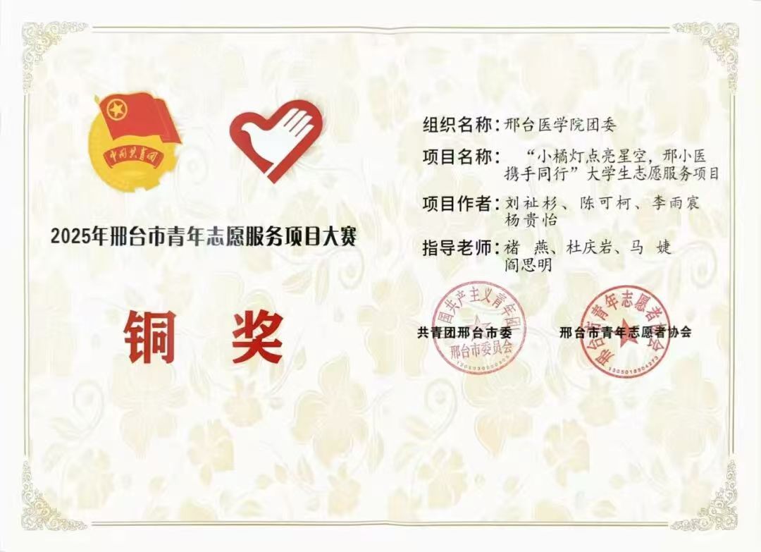 近日,2025年邢台市青年志愿服务项目大赛圆满落幕。该赛事由共青团邢台市委、市青年志愿者协会联合主办,是全市青年志愿服务力量的集中展示平台。我校团委选送的“青春暖邢 萤火导医 ”大学生志愿服务项目和“小橘灯点亮星空 邢小医携手同行”大学生志愿服务项目分获为老服务类银奖和阳光助残类铜奖。