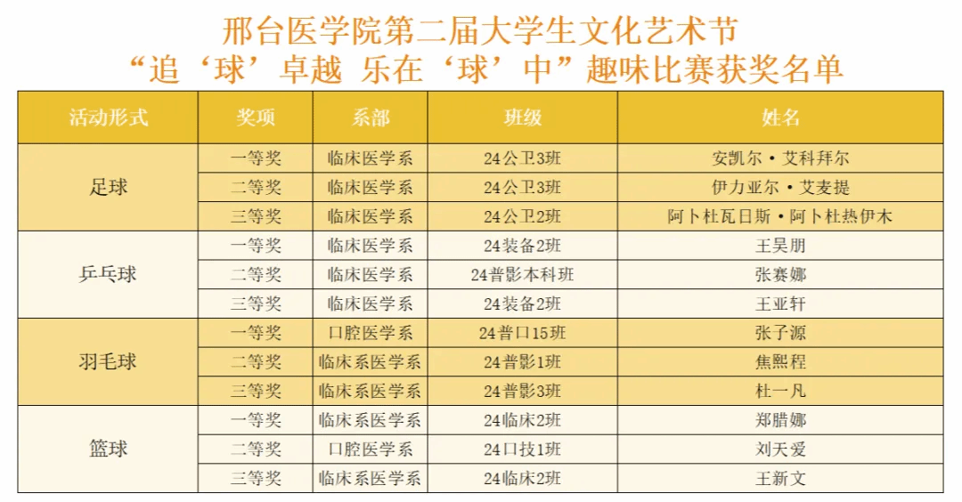 近日,由校团委主办、校学生会及校级球类社团联合承办的以“追‘球’卓越 乐在‘球’中”为主题的邢台医学院第二届大学生文化艺术球类比赛圆满落幕。本次活动涵盖足球、乒乓球、羽毛球、篮球四个项目,吸引全校各社团成员及学生干部积极参与,在校园内掀起“以球会友,乐享运动”的青春热潮。