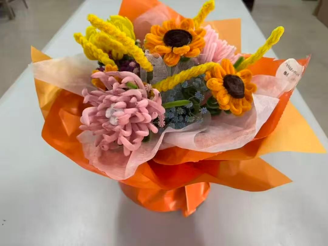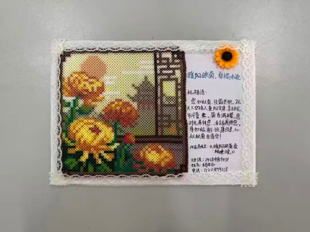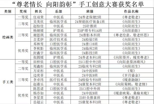 优秀作品亮点突出:手工类中,来自口腔医学系25口技中外2班田梓依同学的《向阳意葵沐晴风》手工钩针花束作品,以 “永不凋谢” 的毛线花传递敬老情与长辈安康的心愿;绘画类中,中医系24养老保健2班任双荣同学的《尊老敬老》绘漫山菊花与祖孙三代作品,尽显阖家温情。经评审,最终20名同学获得奖项。