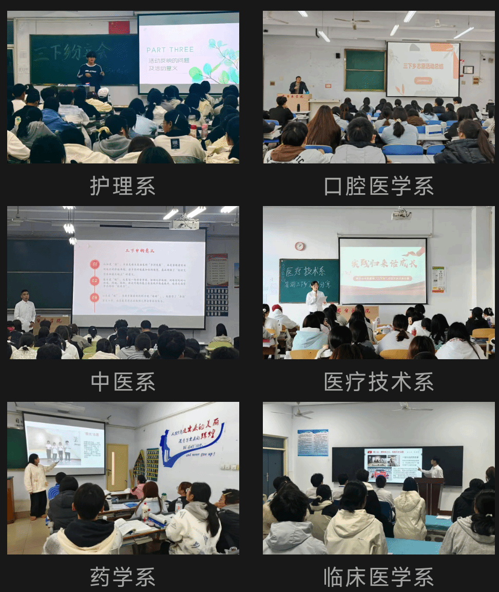 分享会中,各系部实践成果各具特色又同向同行。护理系聚焦健康服务与文化传承,从乡村老人慢病科普、急救技能普及到非遗薪火探寻,展现护理学子心系基层的责任担当;口腔医学系队伍足迹遍布多地,“大爱队”的乡村针灸服务与红色教育、“青梭织梦队”的土布纺织非遗调研等,实现专业实践与文化传承有机融合;中医系以政策解读结合案例拆解,详细讲解“三下乡”筹备全流程,强调“需求调研—方案细化”的实践原则;医疗技术系跨皇寺、钢铁路两校区分享,团队在非遗守护、红色教育、雄安新区战略学习等领域收获颇丰;药学系“微光”、“青芒”等队伍围绕政策宣讲、银龄关爱、基层医疗辅助、乡村支教开展多元化服务,打造“教育+文化+养老”服务模式;临床医学系则通过“三下乡”内容解析与优秀团队经验分享,破除实践“走过场”的误区,让同学们深刻认识到实践是理论转化为解决乡村问题的实战平台。