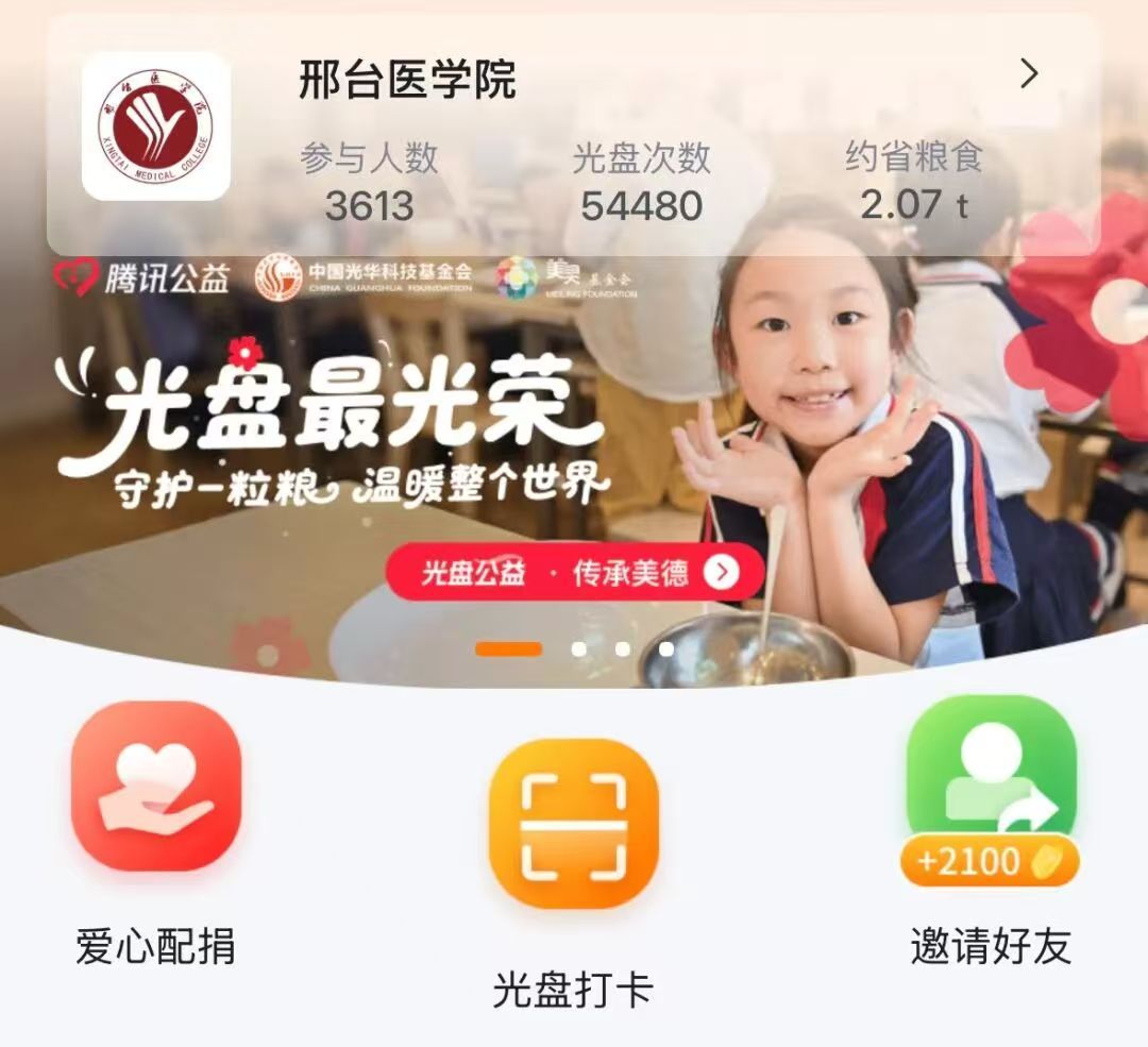 为切实筑牢大学生粮食安全思想防线,近日,邢台医学院大学生社团联合会主办的“节约粮食,从我做起——光盘打卡”活动圆满落下帷幕。为期多日的活动以高参与度、严规范度成为校园文明建设的生动实践。