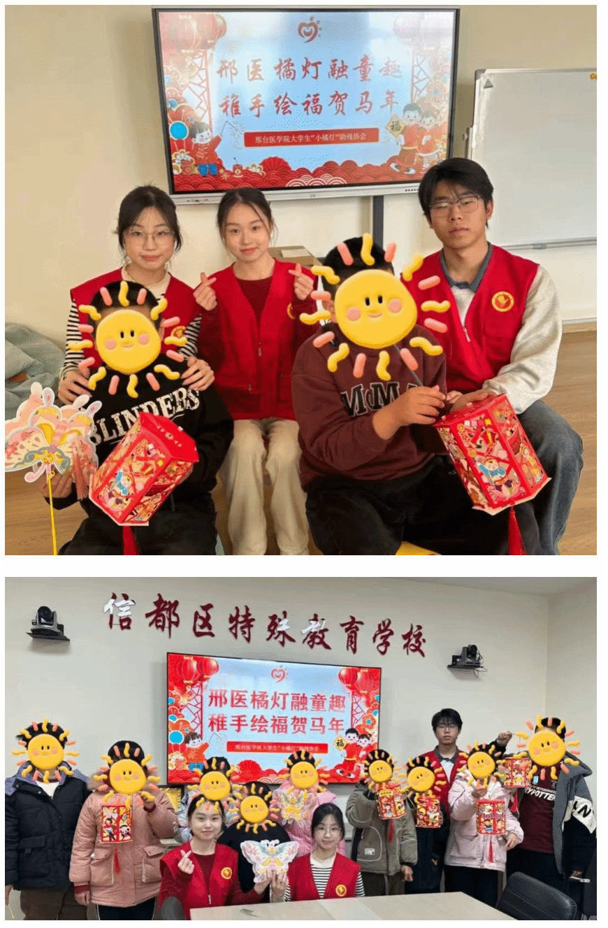 为响应团省委关爱青少年“送温暖”集中行动季号召,12月23日,我校大学生青年志愿者协会骨干与“小橘灯”助残志愿服务队骨干代表,携手走进内丘县特殊教育学校与信都区特殊教育学校,开展“传统节日进校园 团团送温暖”主题志愿服务活动,为特殊儿童送去冬日关怀与节日祝福。