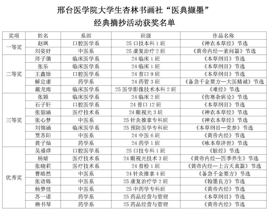 活动于1月份启动,吸引了两个校区610名学子踊跃参与。同学们认真书写《黄帝内经》《伤寒杂病论》《本草纲目》等经典医著,在一撇一捺间品读医道精髓,在笔墨流淌中坚定医者初心。经评选,最终22位同学获奖,其中一等奖2名、二等奖5名、三等奖7名、优秀奖8名。
