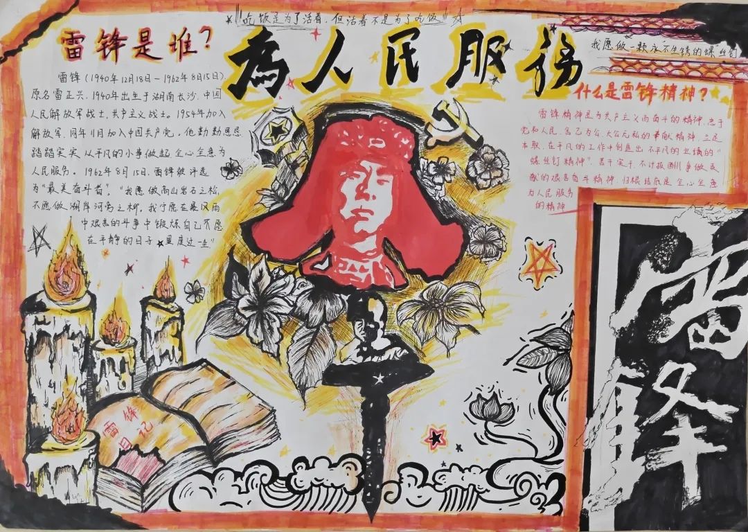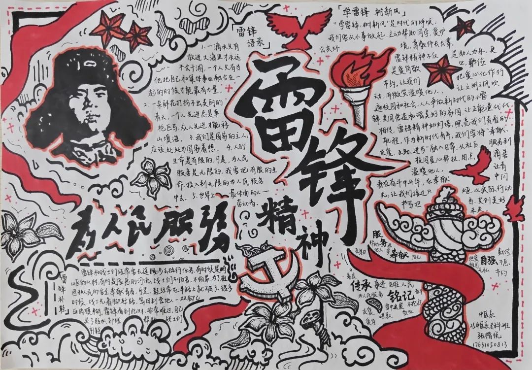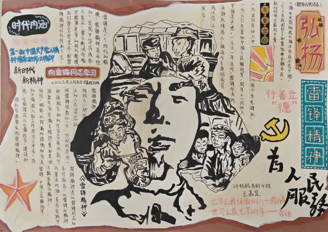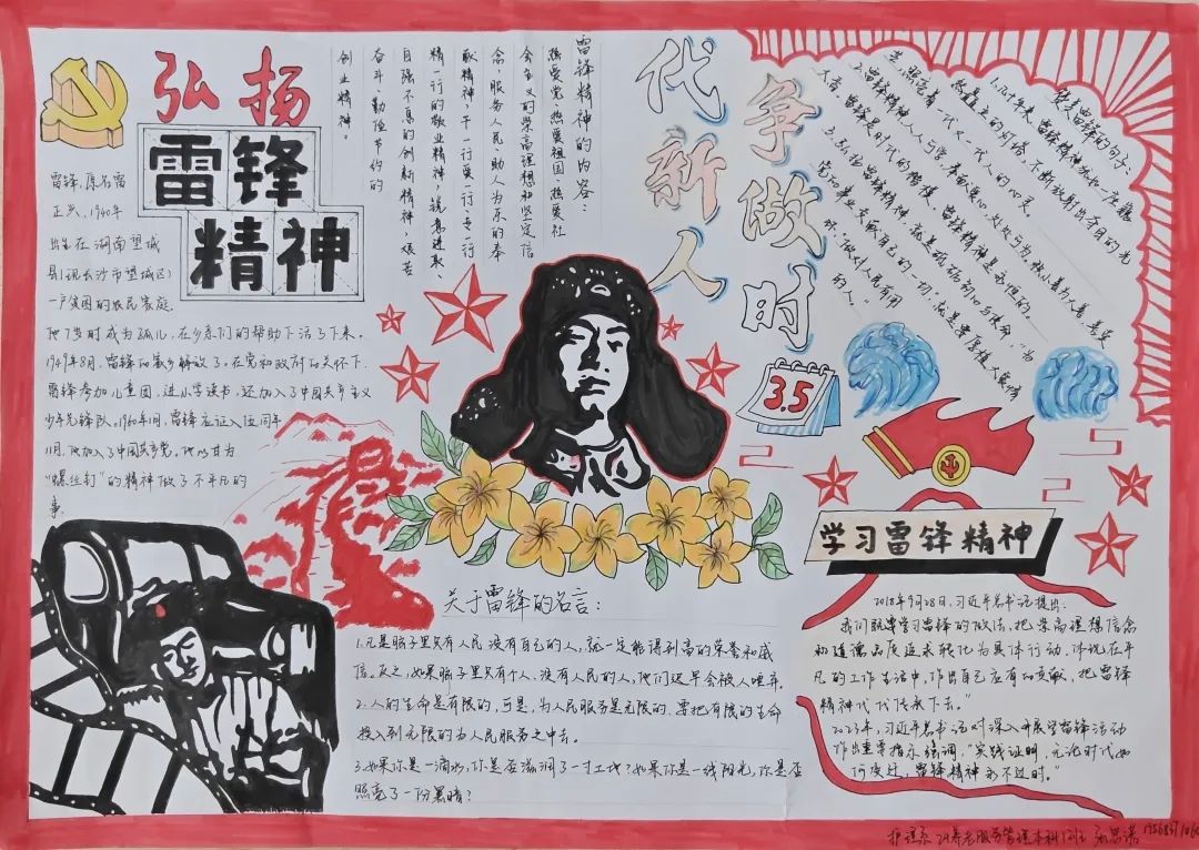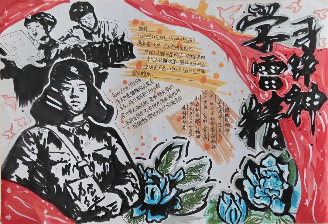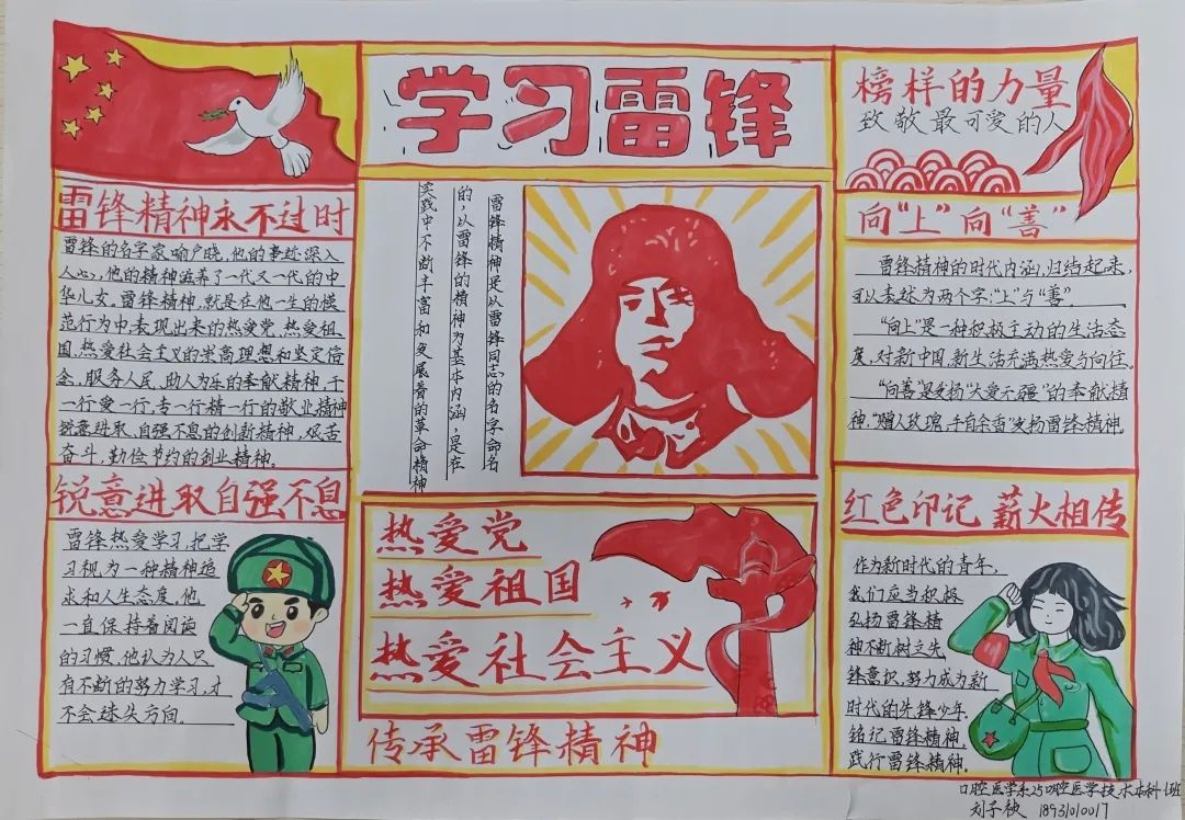 同学们的手抄报作品紧扣“弘扬雷锋精神,争做新时代青年”的核心主题,既有对雷锋生平事迹、经典故事的细腻描绘,也有将雷锋精神融入版式设计、手账元素的巧思创意,更有以鲜活色彩和生动画面传递新时代青年责任担当的深情表达。一张张精心绘制的手抄报,不仅为学生提供了展示才华的舞台,更将专业教育与美育实践深度融合,成为一次浸润心灵的精神洗礼。经过评审,中医系刘姿妤、临床系何东颖和医疗技术系范书宁,获得一等奖。