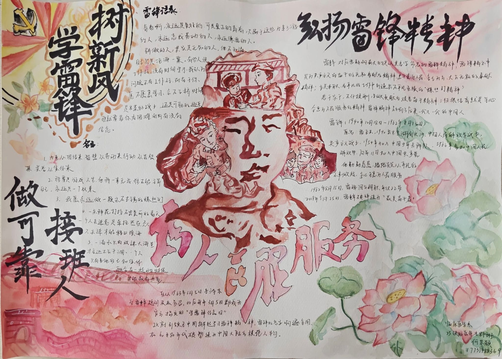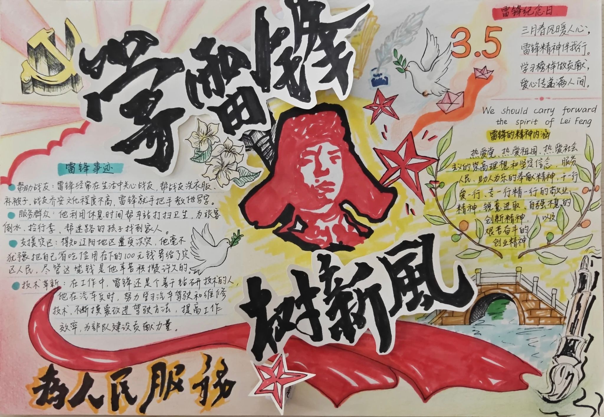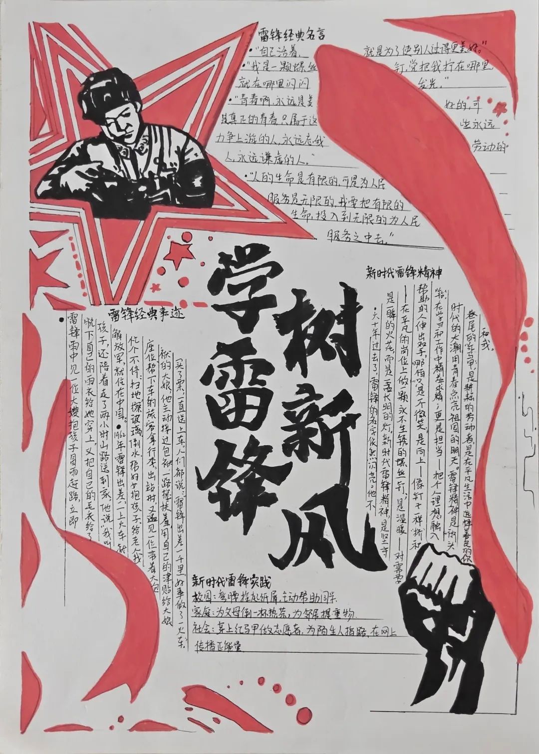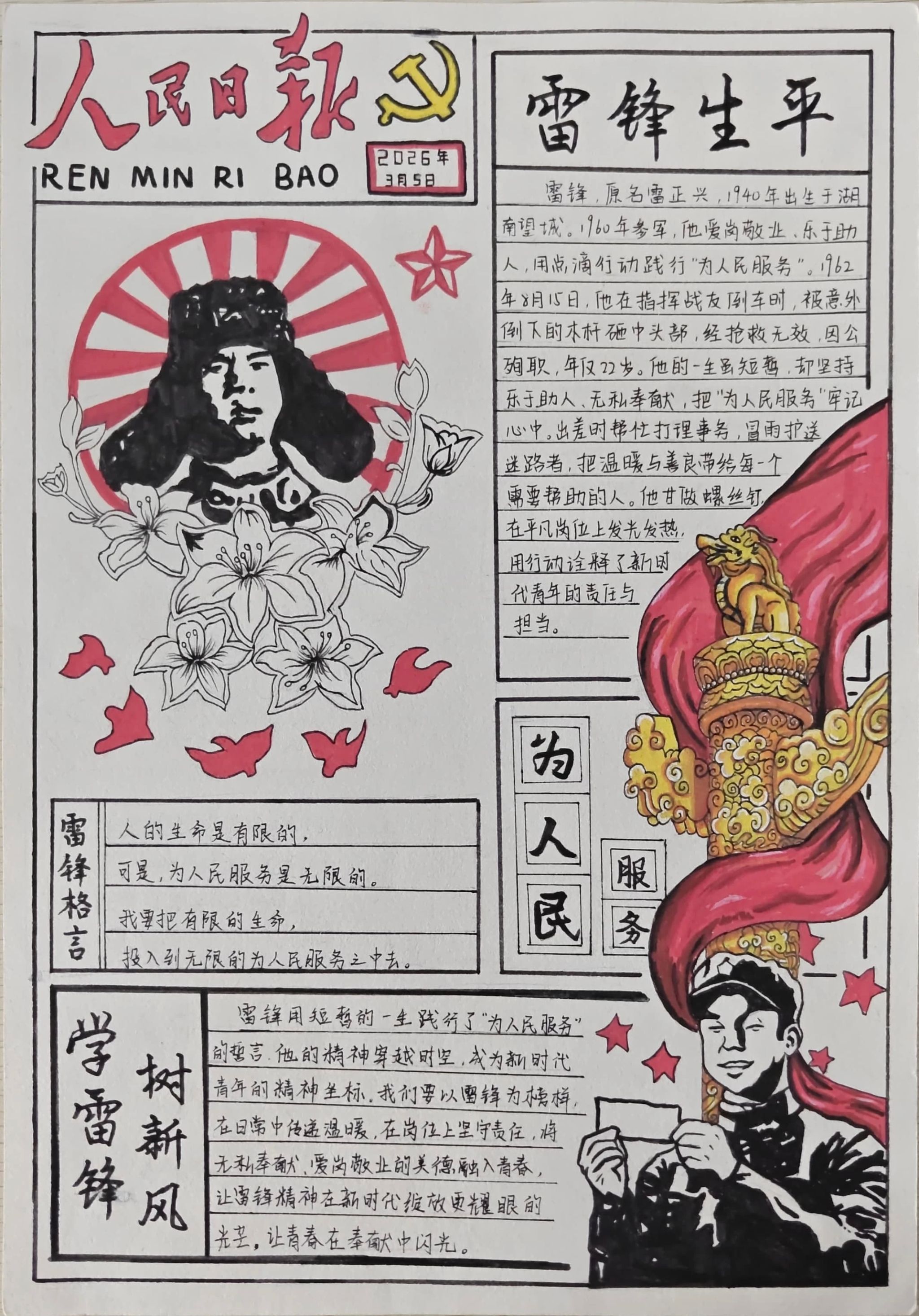 同学们的手抄报作品紧扣“弘扬雷锋精神,争做新时代青年”的核心主题,既有对雷锋生平事迹、经典故事的细腻描绘,也有将雷锋精神融入版式设计、手账元素的巧思创意,更有以鲜活色彩和生动画面传递新时代青年责任担当的深情表达。一张张精心绘制的手抄报,不仅为学生提供了展示才华的舞台,更将专业教育与美育实践深度融合,成为一次浸润心灵的精神洗礼。经过评审,中医系刘姿妤、临床系何东颖和医疗技术系范书宁,获得一等奖。