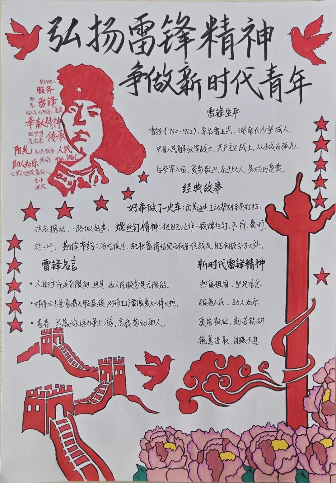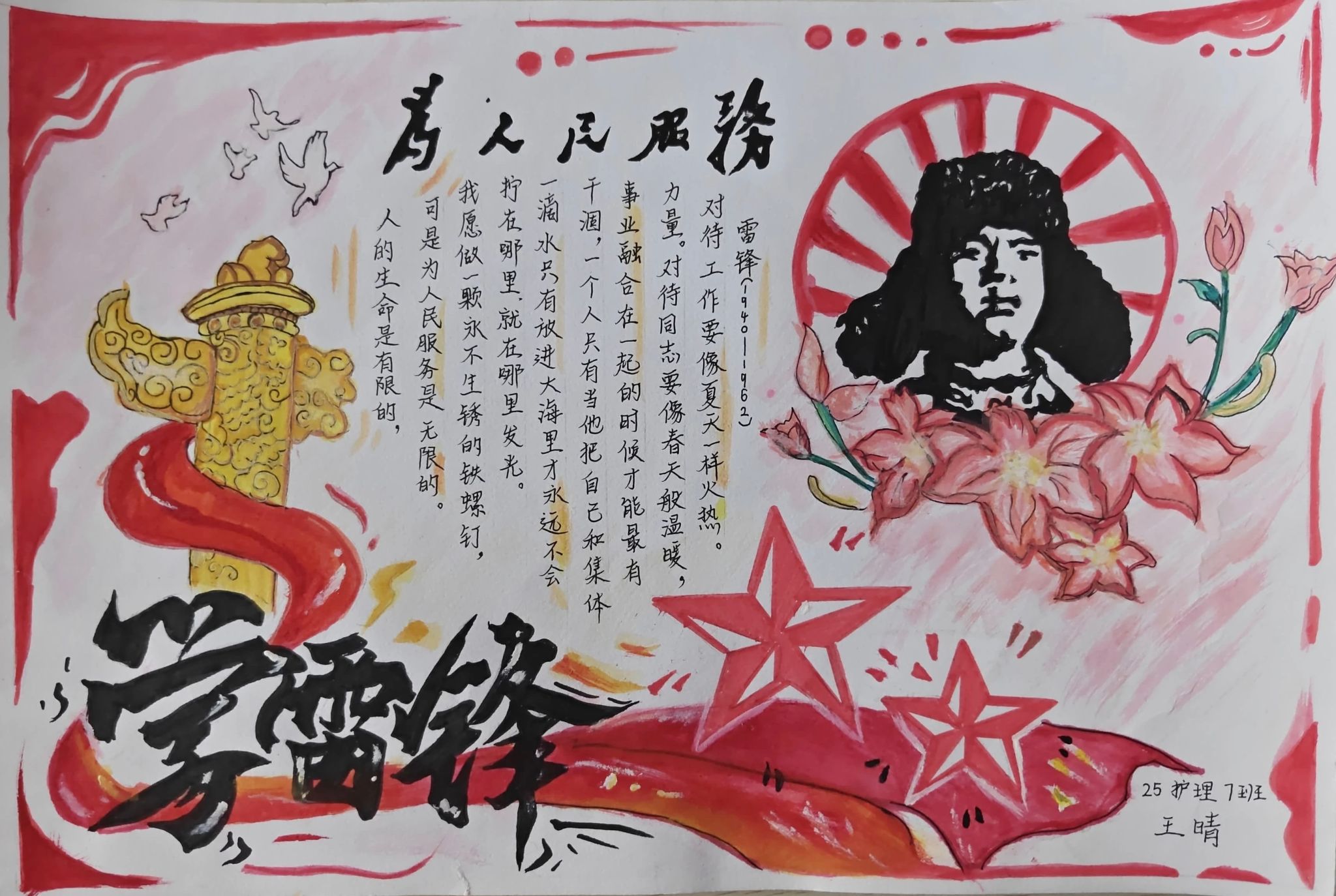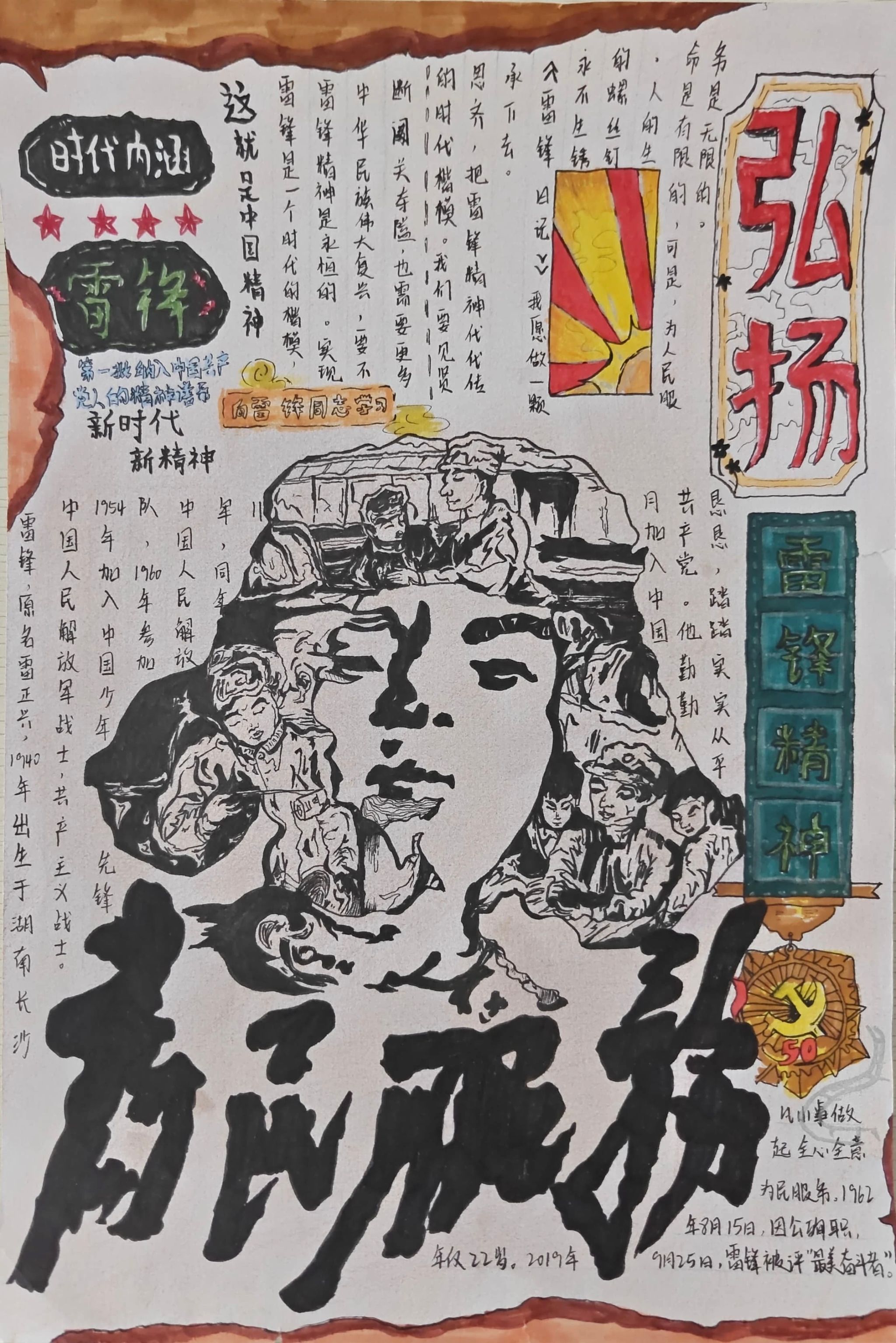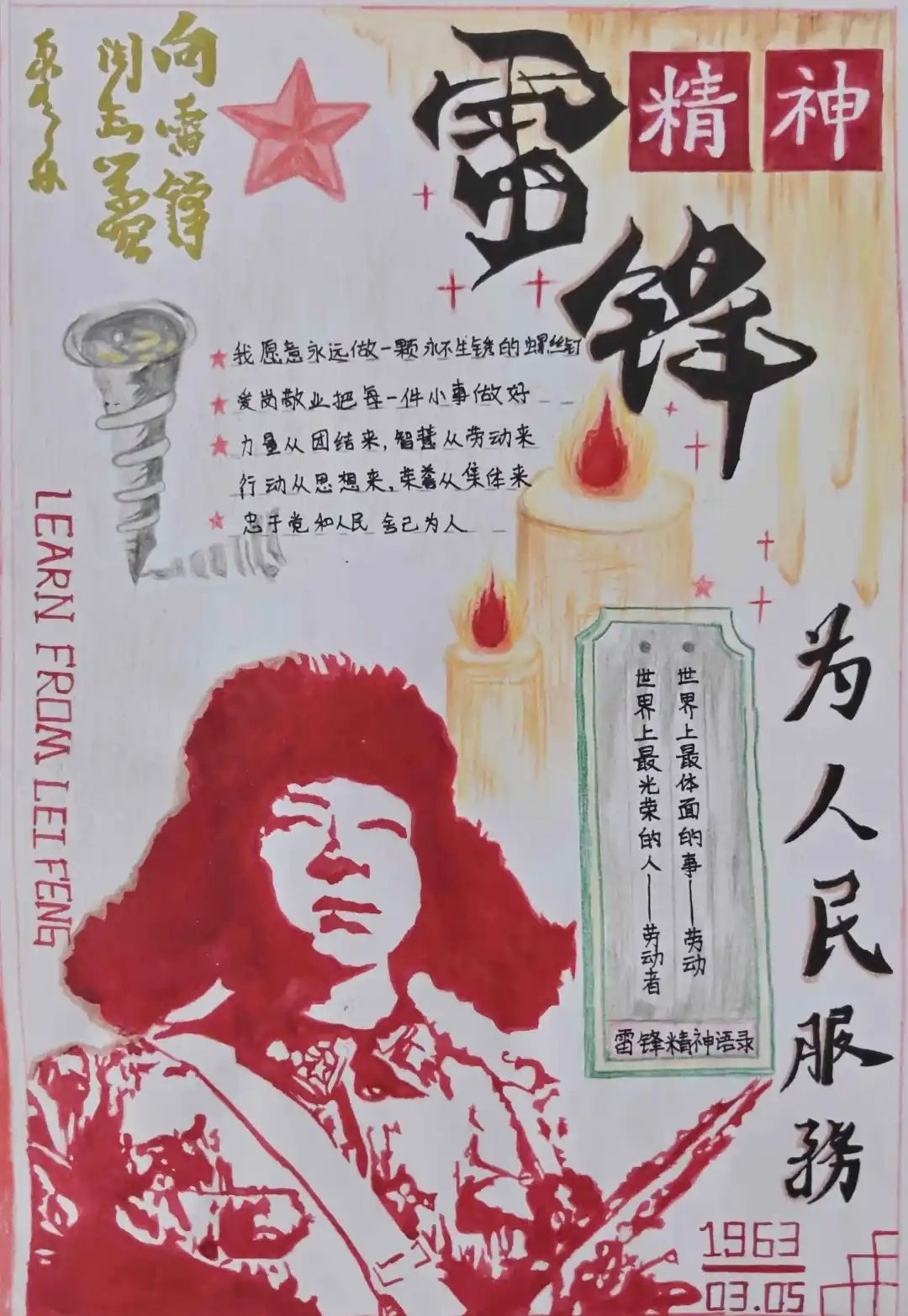 同学们的手抄报作品紧扣“弘扬雷锋精神,争做新时代青年”的核心主题,既有对雷锋生平事迹、经典故事的细腻描绘,也有将雷锋精神融入版式设计、手账元素的巧思创意,更有以鲜活色彩和生动画面传递新时代青年责任担当的深情表达。一张张精心绘制的手抄报,不仅为学生提供了展示才华的舞台,更将专业教育与美育实践深度融合,成为一次浸润心灵的精神洗礼。经过评审,中医系刘姿妤、临床系何东颖和医疗技术系范书宁,获得一等奖。