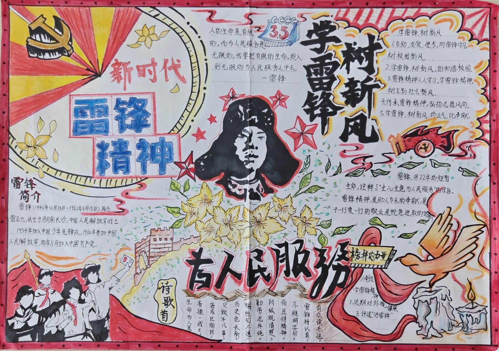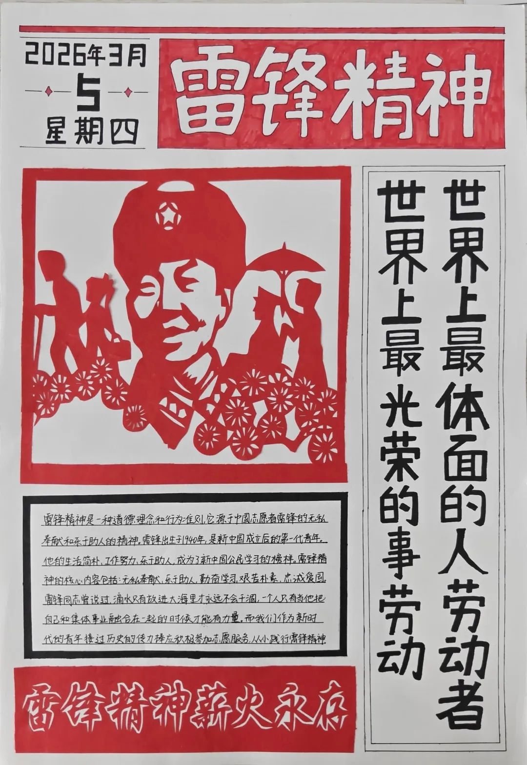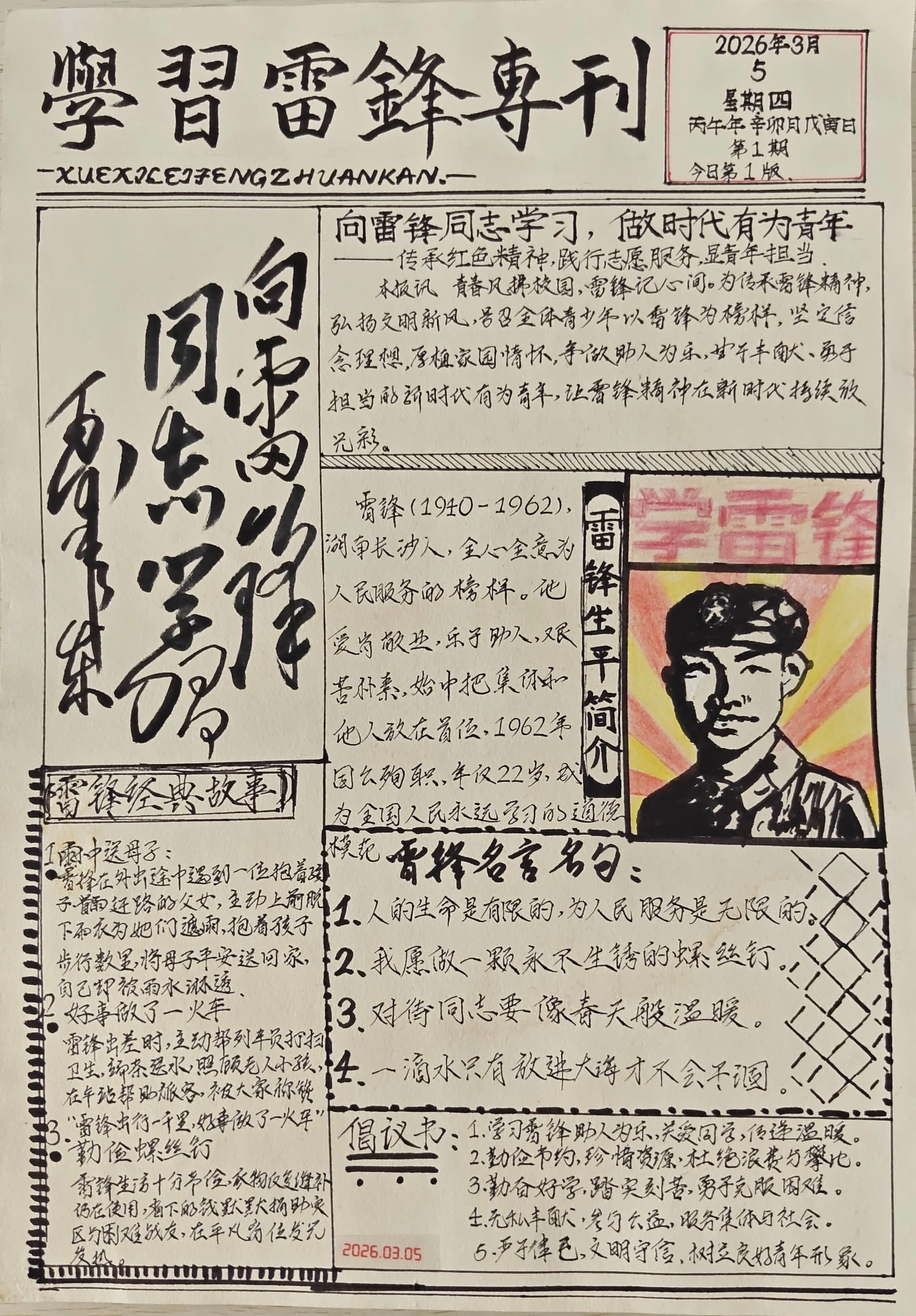 为进一步弘扬雷锋精神,挖掘其时代内涵,引导广大青年学子以实际行动践行新时代榜样力量,营造医者仁心、乐于助人的校园文化氛围,校学生会于2026年3月13日至26日面向全体在校大学生开展“学雷锋·树新风”主题手抄报活动。