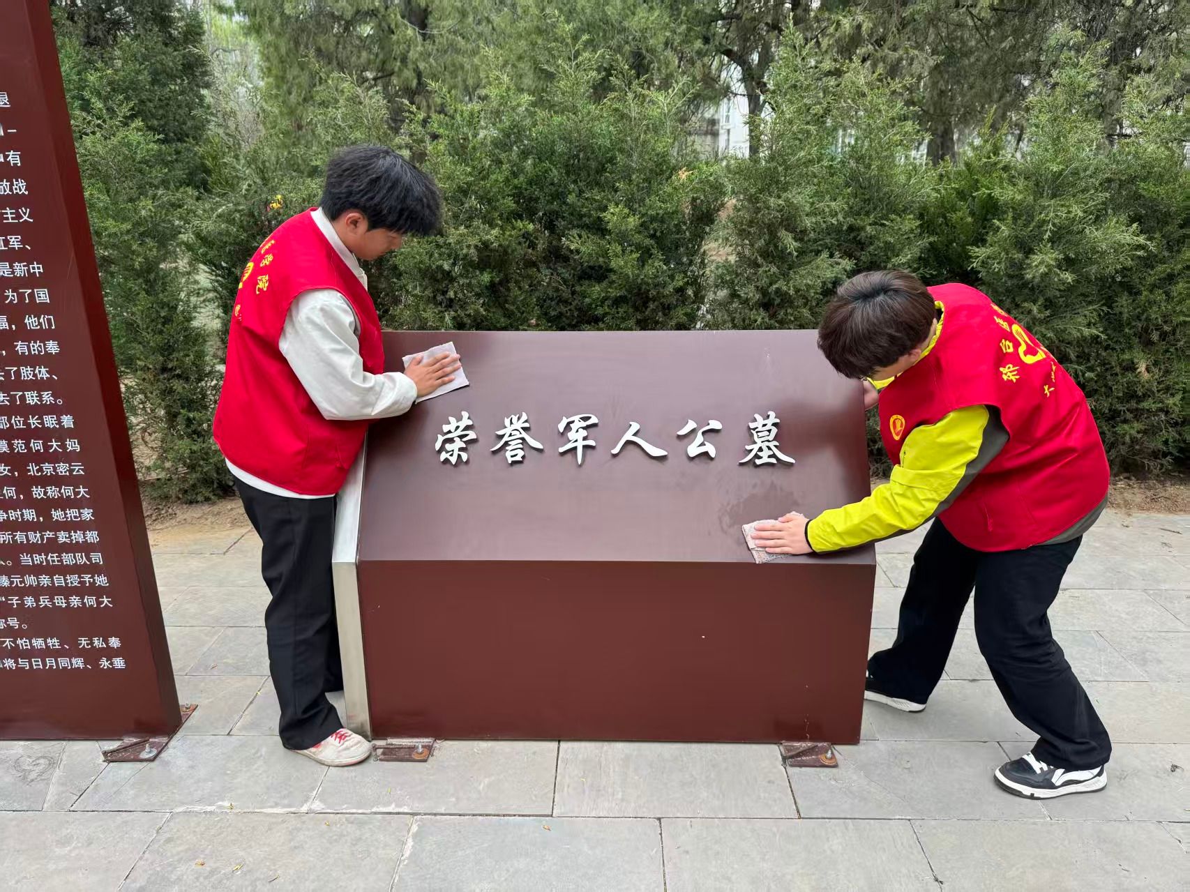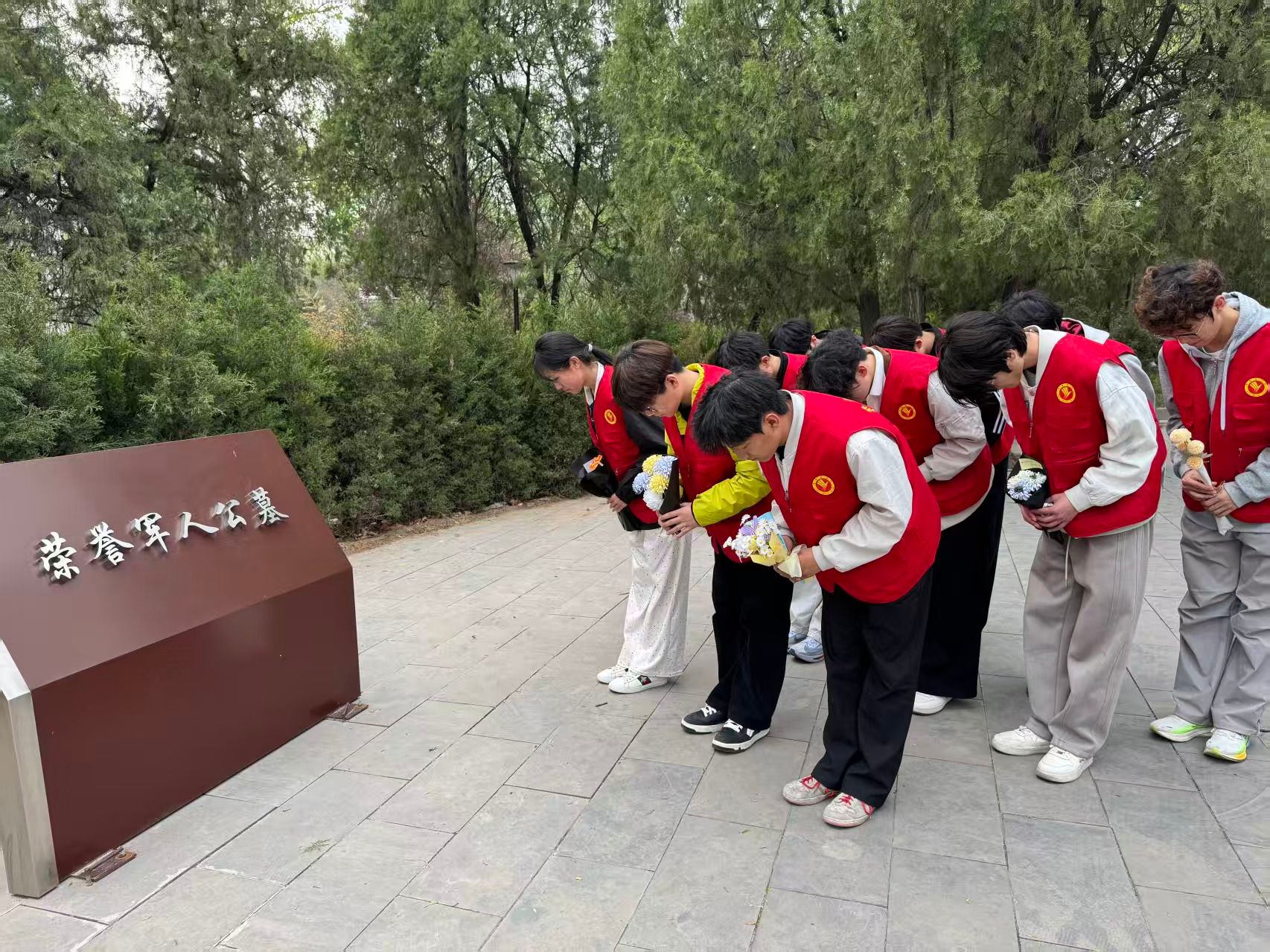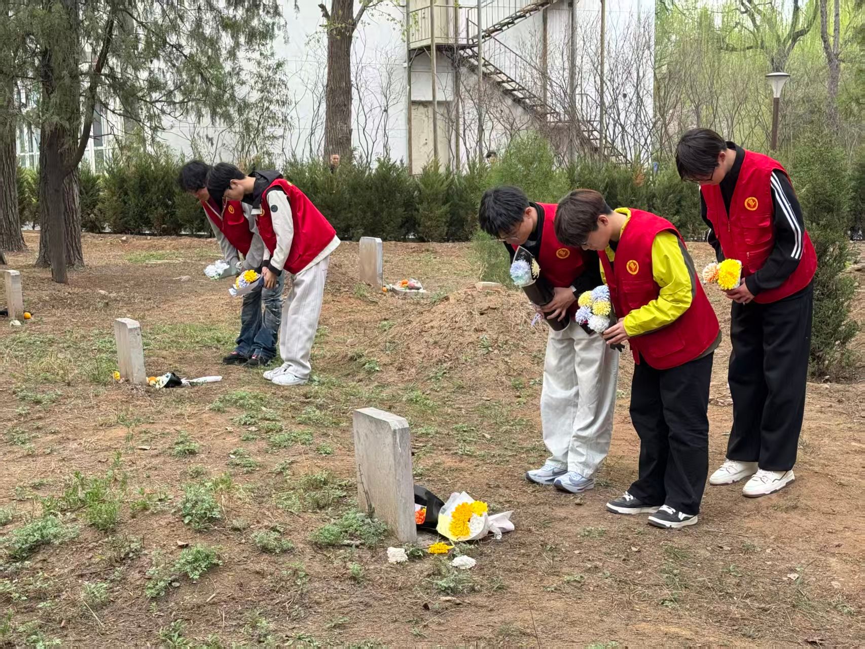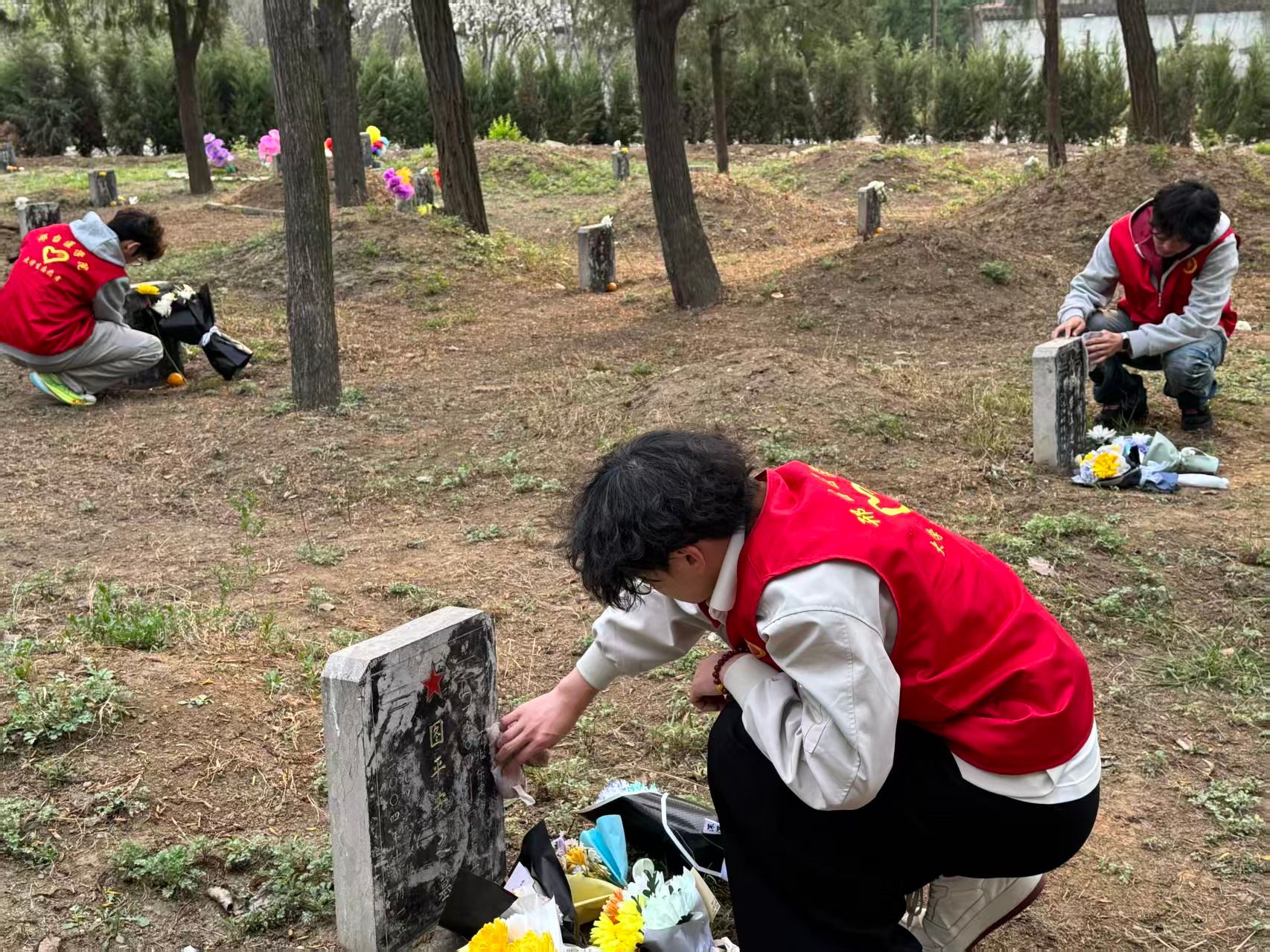 手工花束制作完成后,校团委选派志愿者骨干代表,承载着全校学子的崇敬之心,前往达活泉公园烈士陵园开展扫墓致敬活动。活动现场庄严肃穆,志愿者们整齐列队、鞠躬默哀、敬献花束,以最真挚的敬意缅怀革命英烈,在肃穆的氛围中重温英烈热血报国的峥嵘岁月,感悟不朽的民族脊梁精神。