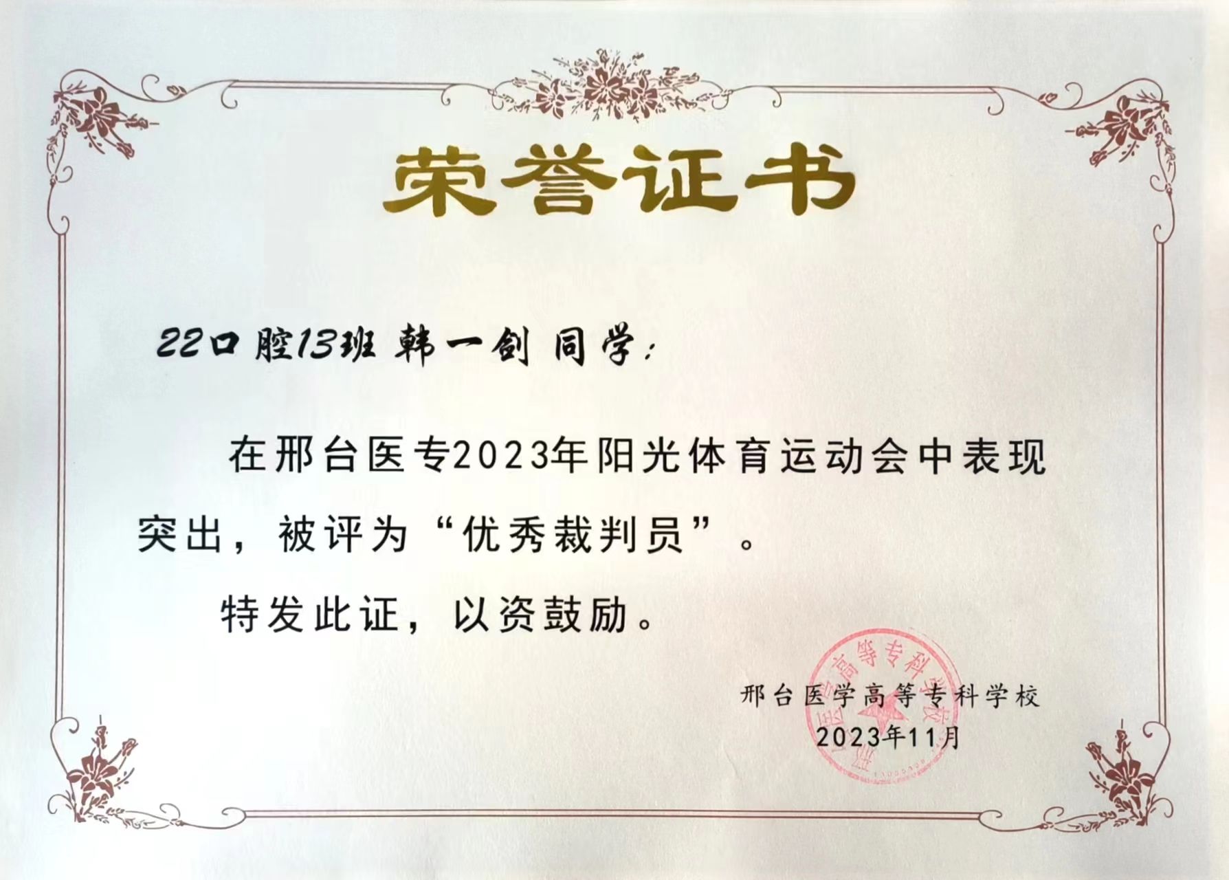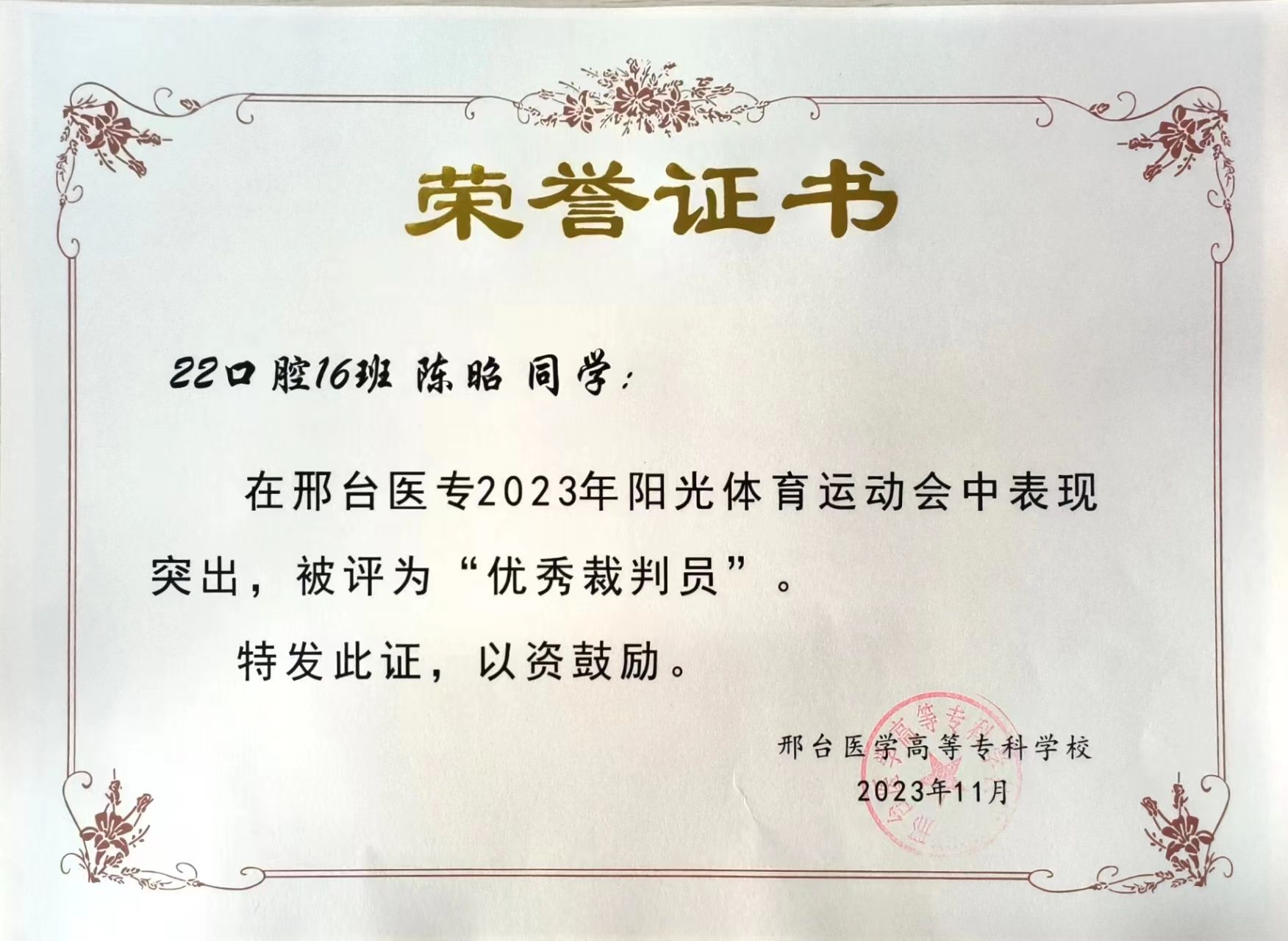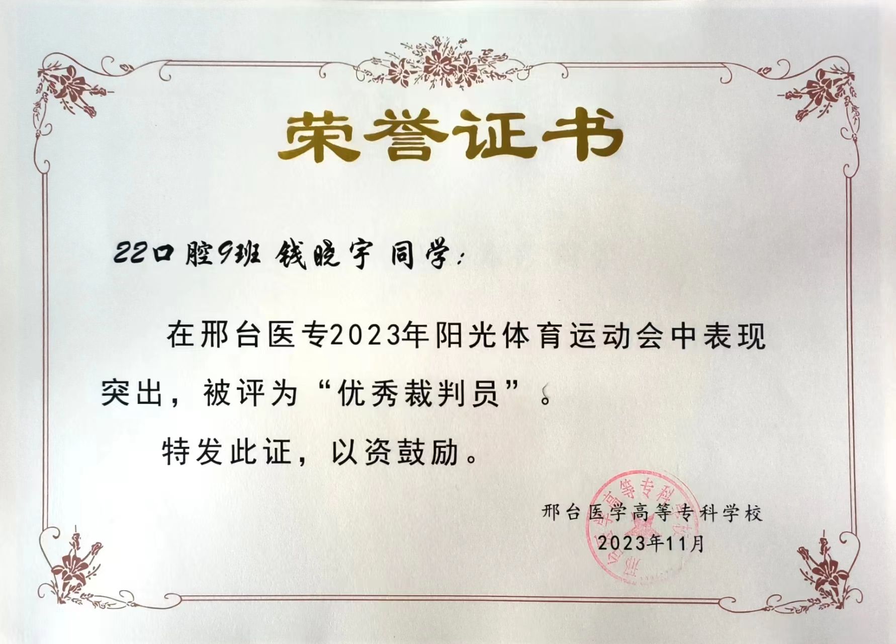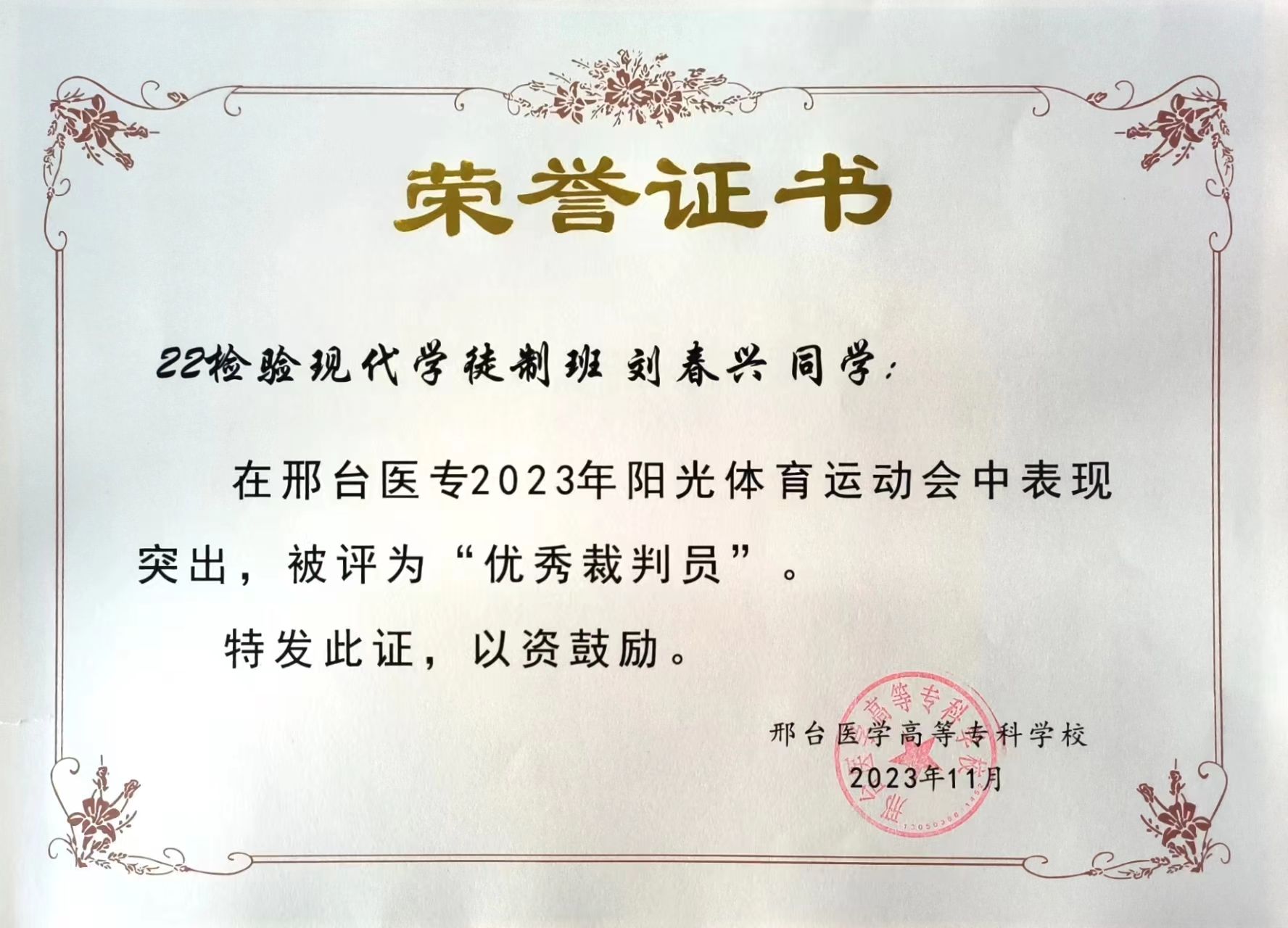 邢台医专2023年阳光体育运动会中被评为“优秀裁判员”
